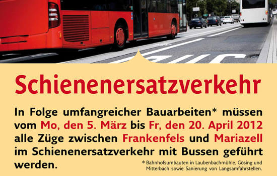 Aufgrund der Bahnhofsumbauten in Laubenbachmühle, Gösing und Mitterbach sowie der Sanierung von Langsamfahrstellen gibt es zwischen Frankenfels und Mariazell vom 5. März bis 20. April 2012 einen Schienenersatzverkehr mit Bussen.