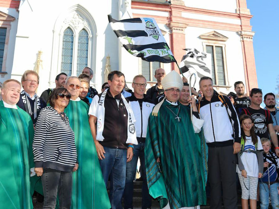 Wunderbares Wetter und stürmischer Wind – ideale Bedingungen für die Wallfahrt des SK Puntigamer Sturm Graz am Sonntag, 14. Oktober 2018 nach Mariazell. Präsident Christian Jauk führte die schwarz-weißen Wallfahrer an, die vor der Basilika von Diözesanbischof Wilhelm Krautwaschl empfangen wurden.