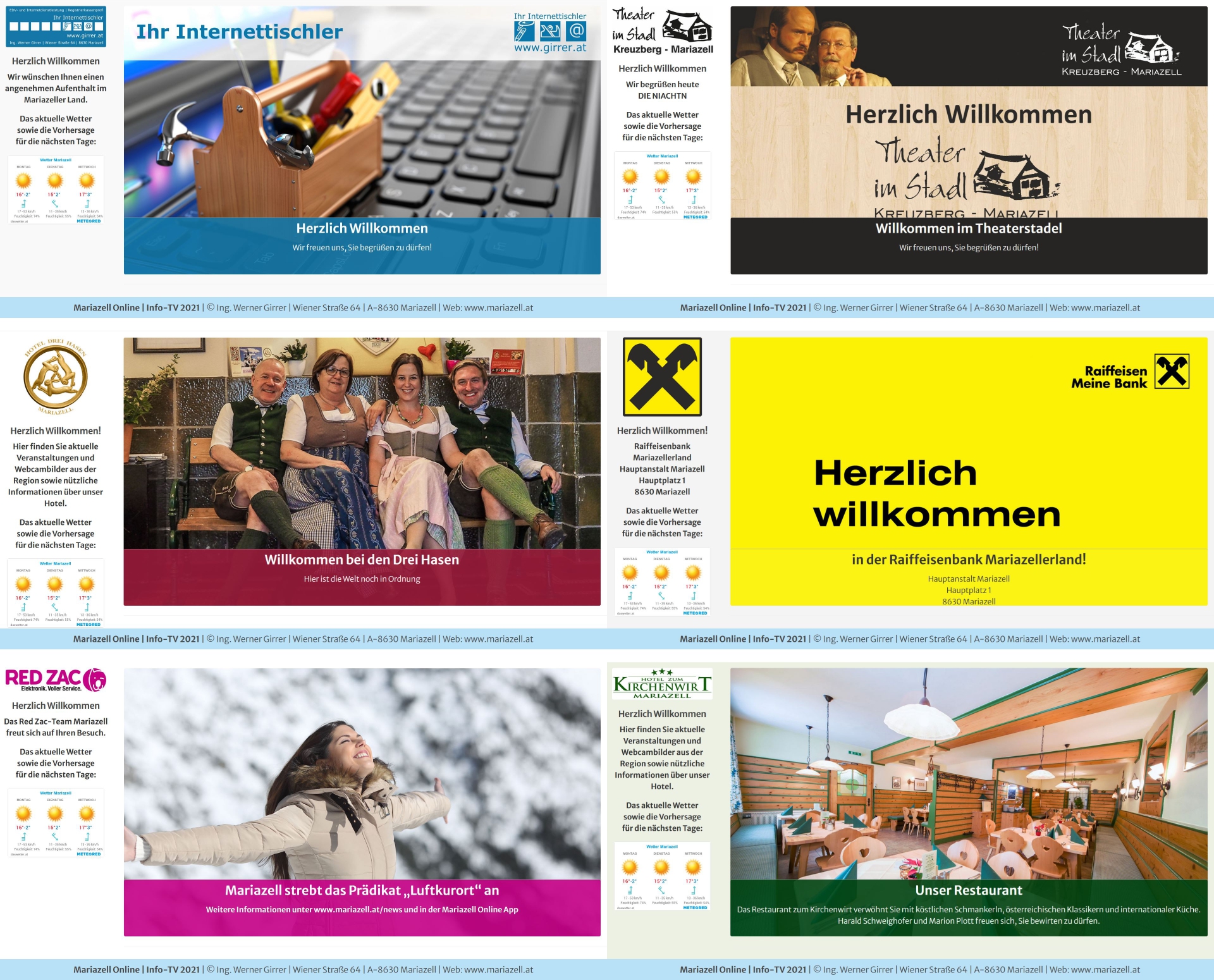 Mitgliedsbetriebe von Mariazell-Online haben ab sofort die Möglichkeit, das Mariazell – Online | Info-TV kostenlos auch in einer personalisierten Variante darzustellen und somit den Gästen ein „hauseigenes“ Info-TV anzubieten. Stets aktuell und völlig ohne Wartungsaufwand. Das könnte dann beispielsweise so aussehen: