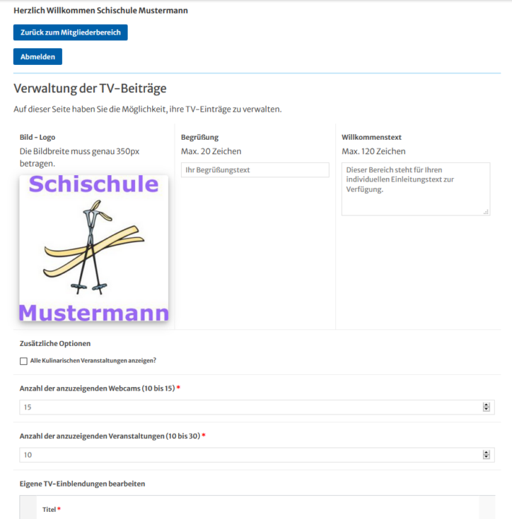 Über ein Webinterface besteht die Möglichkeit, bis zu vier eigene Seiten selbst zu gestalten und zusätzlich zu den Kamerabildern und Veranstaltungstipps in den automatischen Programmablauf zu integrieren. Auch die Anzahl der Livecam-Bilder und Veranstaltungen kann den eigenen Wünschen entsprechend angepasst werden.