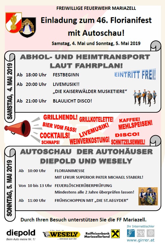 Besuchen Sie das Florianifest der FF Mariazell und unterstützen Sie unsere Feuerwehr. Wir wünschen Ihnen gute Unterhaltung!