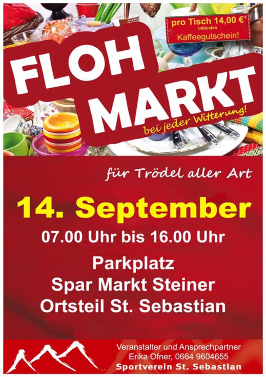 Am Samstag, 14. September findet am Parkplatz vor dem SPAR-Markt Steiner in St. Sebastian wieder ein Flohmarkt für Trödel aller Art, veranstaltet vom SV St. Sebastian, statt.