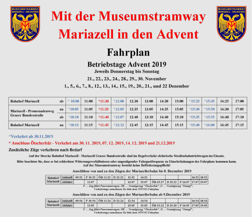 Fahrplan Museumstramway beim Mariazeller Advent 2019