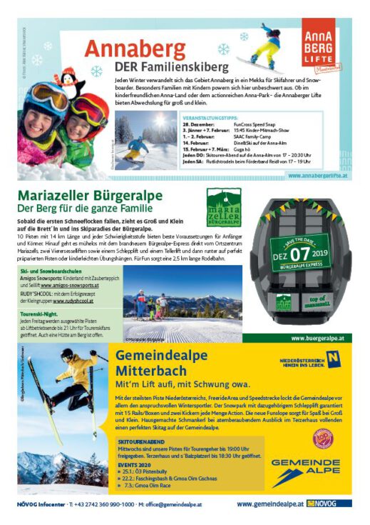 Während sich der Annaberg besonders bunt für die ganze Familie präsentiert, ist die Gemeindealpe mit der steilsten Piste Niederösterreichs und einer Freeride Area etwas für anspruchsvolle Wintersportler. Auf der Mariazeller Bürgeralpe warten hingegen breite Pisten, eine beleuchtete Rodelbahn und die neue Einseil-Umlaufbahn „Bürgeralpe-Express“.