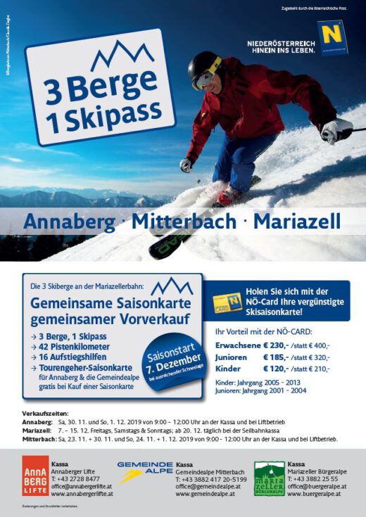 Mit der Niederösterreich-Card gestaltet sich das Pistenvergnügen mit einem besonders guten Preis-Leistungsverhältnis. Statt um € 400,- kann die Saisonkarte für Erwachsene um nur € 230,- erworben werden, auch Junioren (Jahrgang 2001 – 2004) und Kinder (Jahrgang 2005 – 2013) kommen in den Genuss einer großzügigen Ermäßigung. So kostet die Saisonkarte für Junioren nur € 185,- statt € 320,- und für Kinder nur € 120,- statt € 210,-. Die Saisonkarten können bei den jeweiligen Kassen erworben werden.