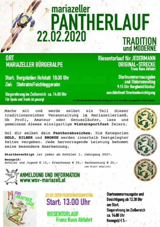 Am 22. Februar 2020 feiert der traditionsreiche Pantherlauf nach 27 Jahren ein Comeback. Das von 1934 bis 1993 jährlich ausgetragene Skirennen wird vom WSV Mariazell unter dem Motto „Tradition und Moderne“ auf seiner Originalstrecke auf der Mariazeller Bürgeralpe als Sportfest des Wintersports mit Arzberger‘s Pantherstrick als Partner veranstaltet. Der traditionsreiche Event ist für Profis, Amateure und Genussläufer gleichermaßen geeignet. Allen Teilnehmern wird ein dem Original nachempfundenes Pantherabzeichen in den Kategorien Gold, Silber oder Bronze nach festgelegten Zeiten verliehen. Im Vordergrund steht die Freude am Sport.