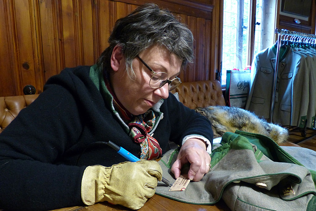Die neue Jägerleinen-Jacke für Damen wird von vielen kleinen, oft nicht auf den ersten Blick wahrnehmbaren, jedoch liebevollen Details geprägt. Die Jacke hat eine Achselklappe – typisch für die jagdliche Form. Im Nacken findet sich ein Hirschhornknopf – dort hängt man den Gucker ein, damit er nicht im Nacken drückt. Die Rückenfalte trägt anstelle der obligaten „Schneiderfliege“ den Mariazellstick und ist mit grünem Loden unterlegt. Der Dragoner lässt sich nach innen durchziehen und dort zuknöpfen – die Rückenfalte ist dann offen, trotzdem fällt die Jacke modisch schmal.