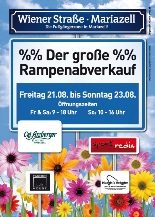 Auch heuer gibt es in der Wiener Straße wieder einen großen Rampenabverkauf. Von Freitag, 21. bis Sonntag, 23. August 2020 findet dieser in der Fußgängerzone – direkt im Stadtzentrum von Mariazell – statt.