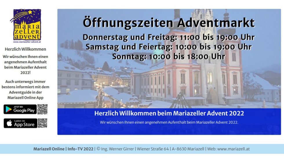 Die Internettischlerei Ing. Werner Girrer, die seit 25 Jahren die Website mariazell.at betreut, hat für den Veranstalter des Advents neben dem Mariazeller Adventguide für Android und iPhone auch das Mariazeller Advent-TV entwickelt. Auch heuer kann dieser Service wieder genutzt werden.