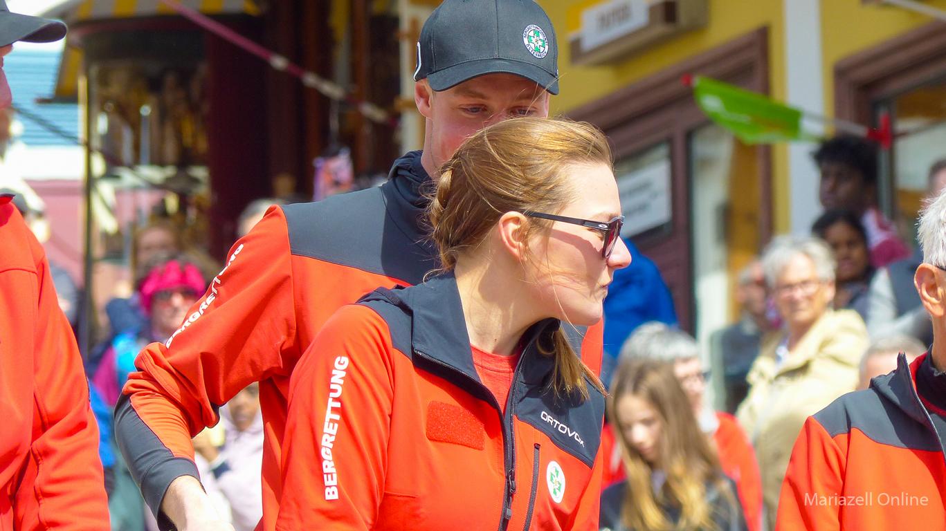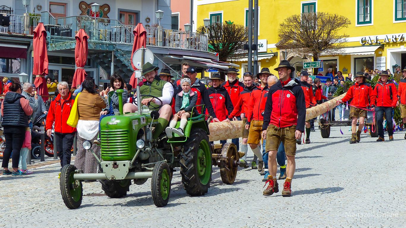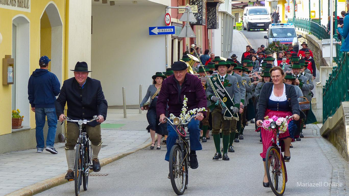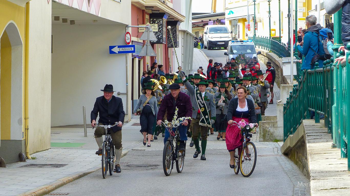 Angeführt von einer Gruppe nostalgischer Fahrräder des Motorveteranenclubs Mariazell sowie der Stadtkapelle Mariazell unter Stabführer Christian Fluch und Kapellmeister Andreas Schweiger zogen die Männer und Frauen der Bergrettung auch heuer wieder mit dem frisch geschlägerten Maibaum – wie jedes Jahr zur Verfügung gestellt von der Bürgerlichen Forstkommune Mariazell – vom Heimathaus entlang der Wiener Straße zum Hauptplatz.