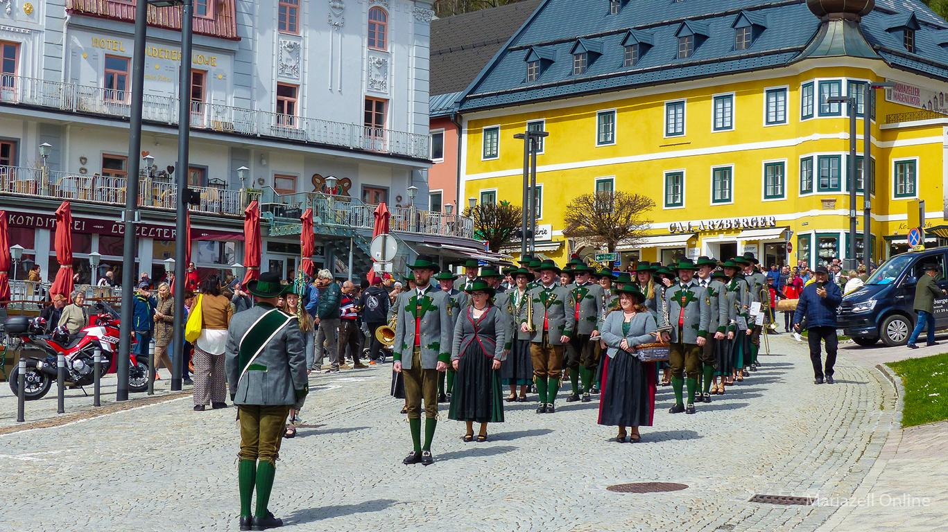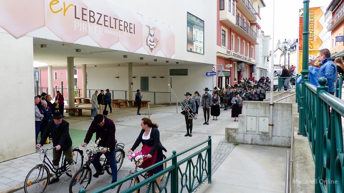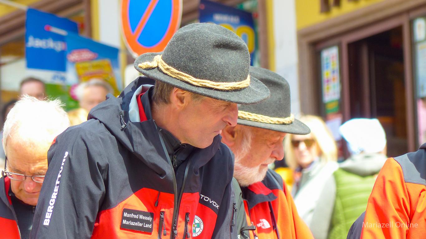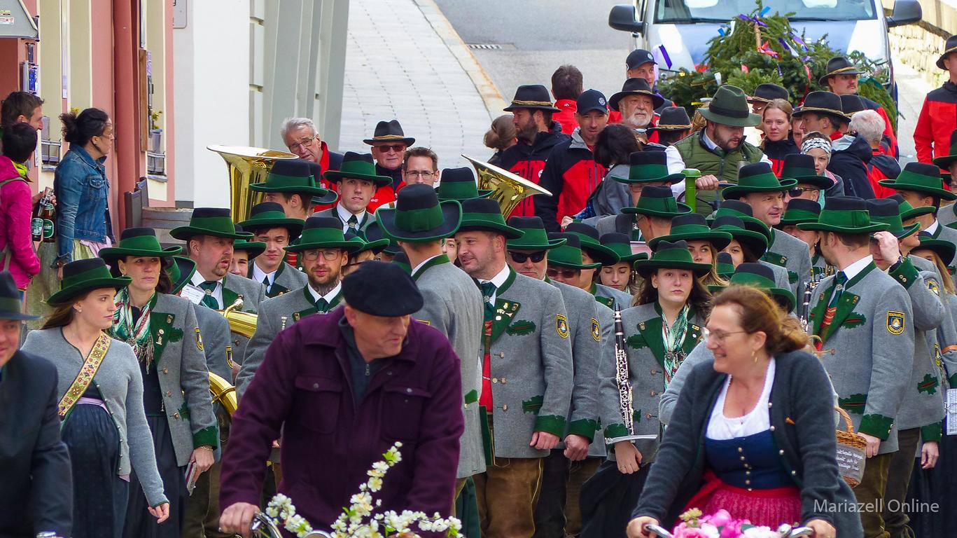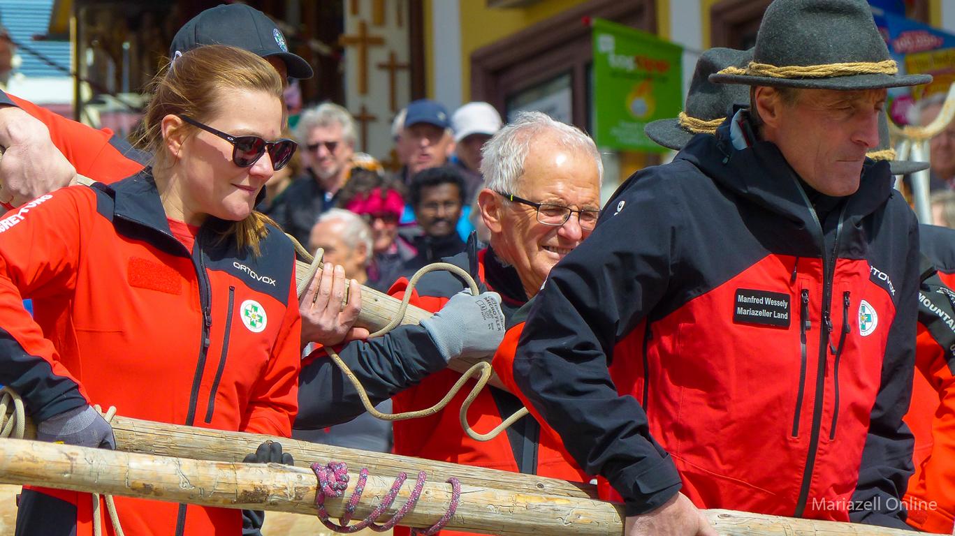 Angeführt von einer Gruppe nostalgischer Fahrräder des Motorveteranenclubs Mariazell sowie der Stadtkapelle Mariazell unter Stabführer Christian Fluch und Kapellmeister Andreas Schweiger zogen die Männer und Frauen der Bergrettung auch heuer wieder mit dem frisch geschlägerten Maibaum – wie jedes Jahr zur Verfügung gestellt von der Bürgerlichen Forstkommune Mariazell – vom Heimathaus entlang der Wiener Straße zum Hauptplatz.