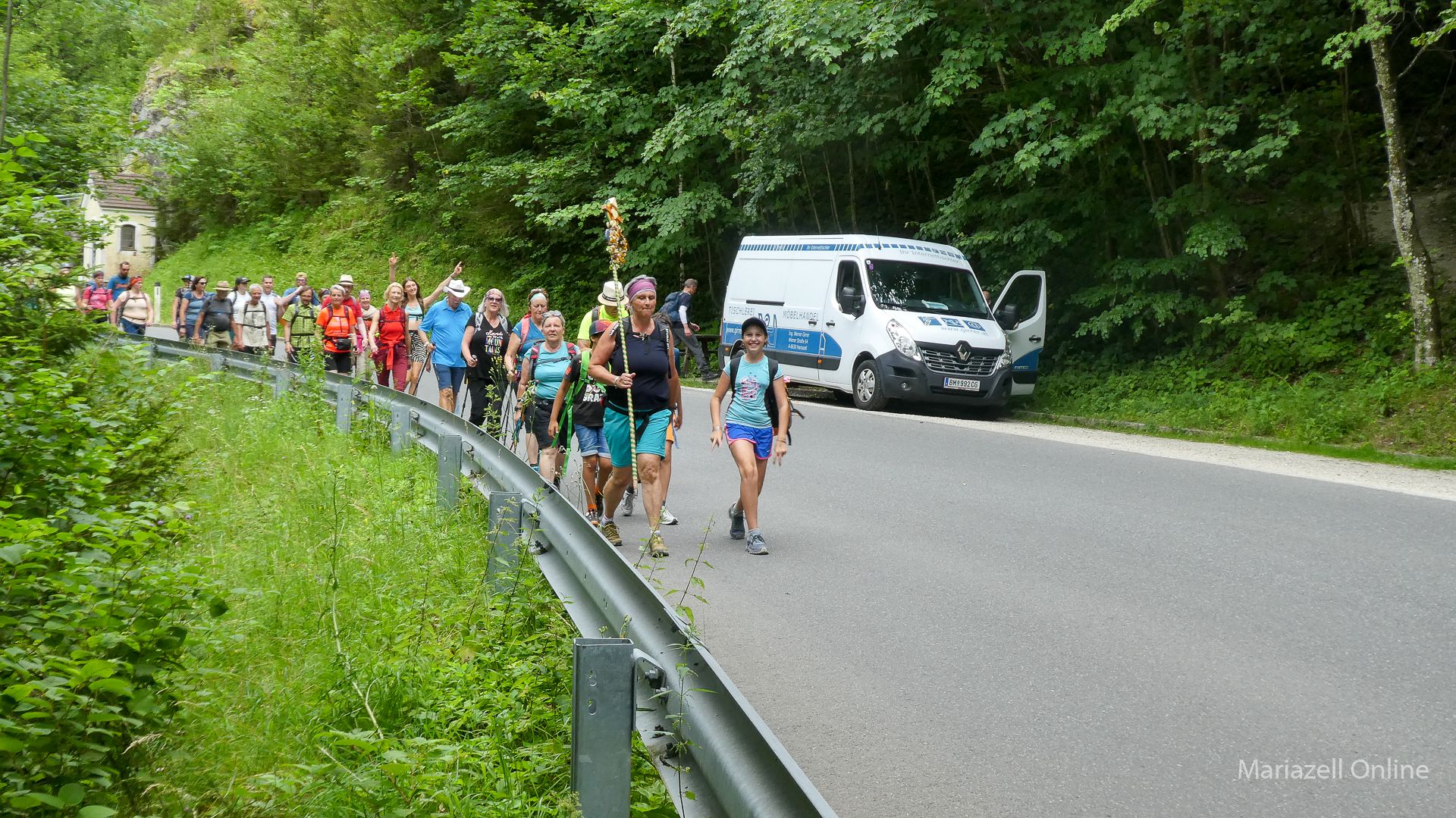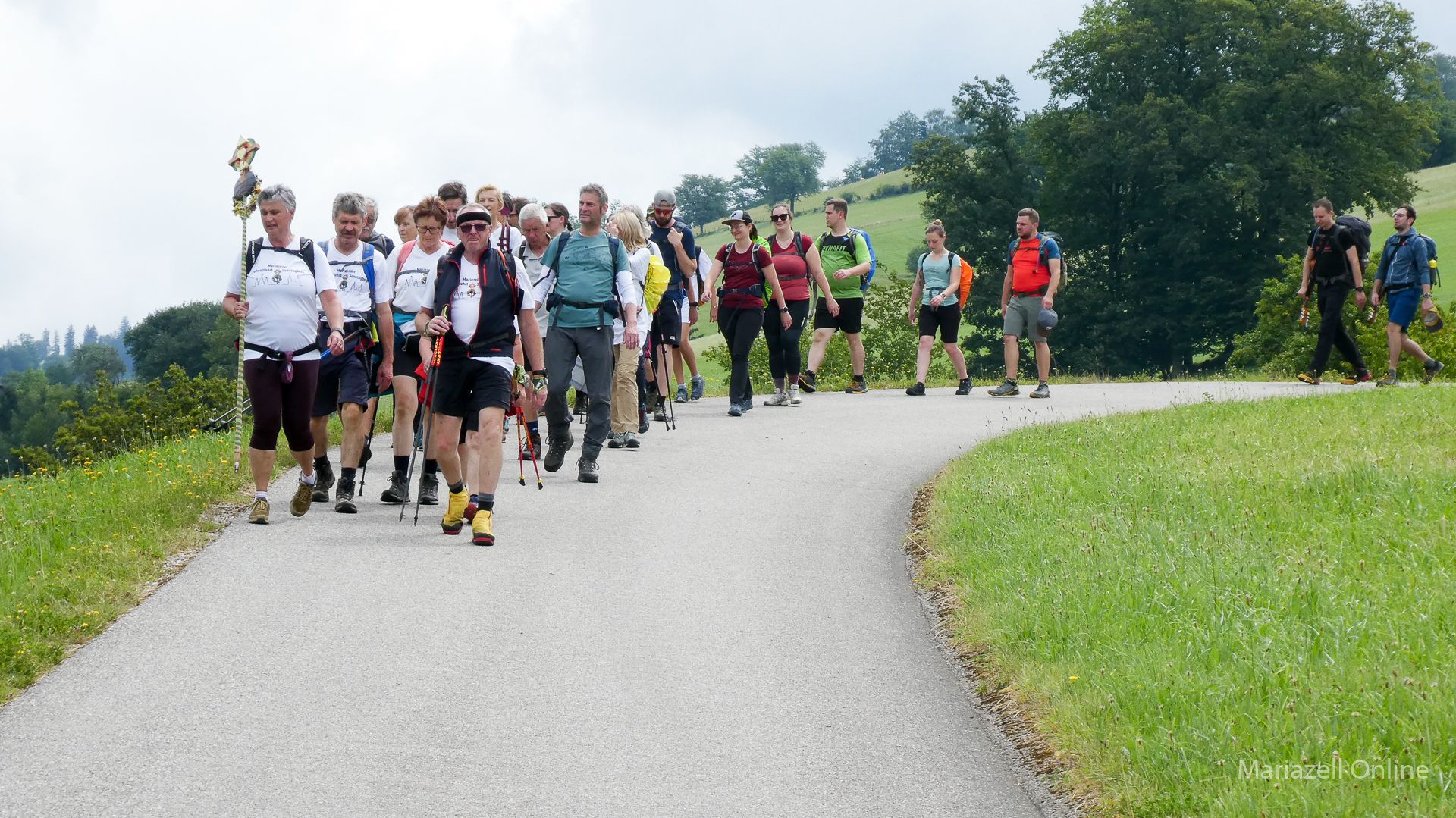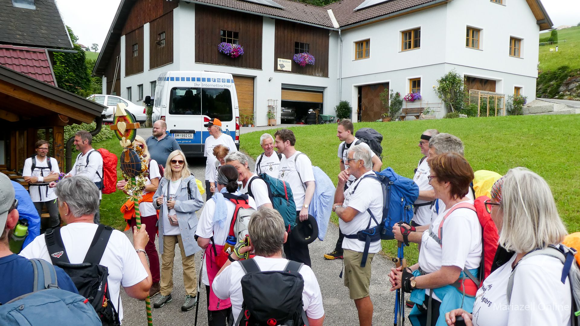 Zuvor wurde wie jedes Jahr das Gepäck im Transporter verladen, Bernhard „Börnie“ Fleischmann sorgte heuer für den Transport. Nach dem Segen machte sich die Gruppe auf den dreitägigen Fußmarsch zum Sonntagberg. Rund 80 km Wegstrecke mit mehr als 3.500 Höhenmetern Aufstieg und fast 3.700 Höhenmetern Abstieg galt es auch heuer wieder zu bewältigen.