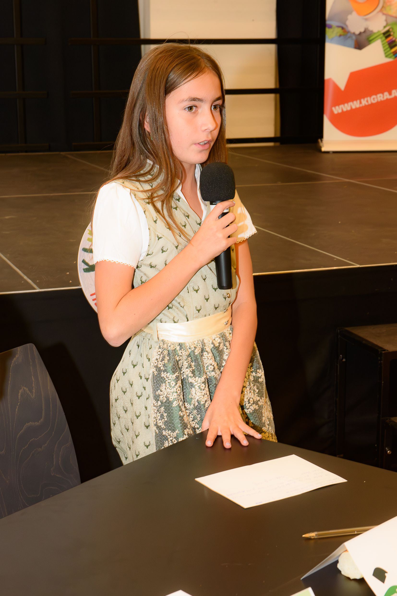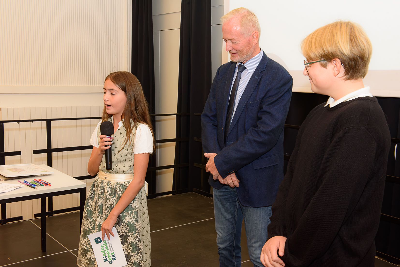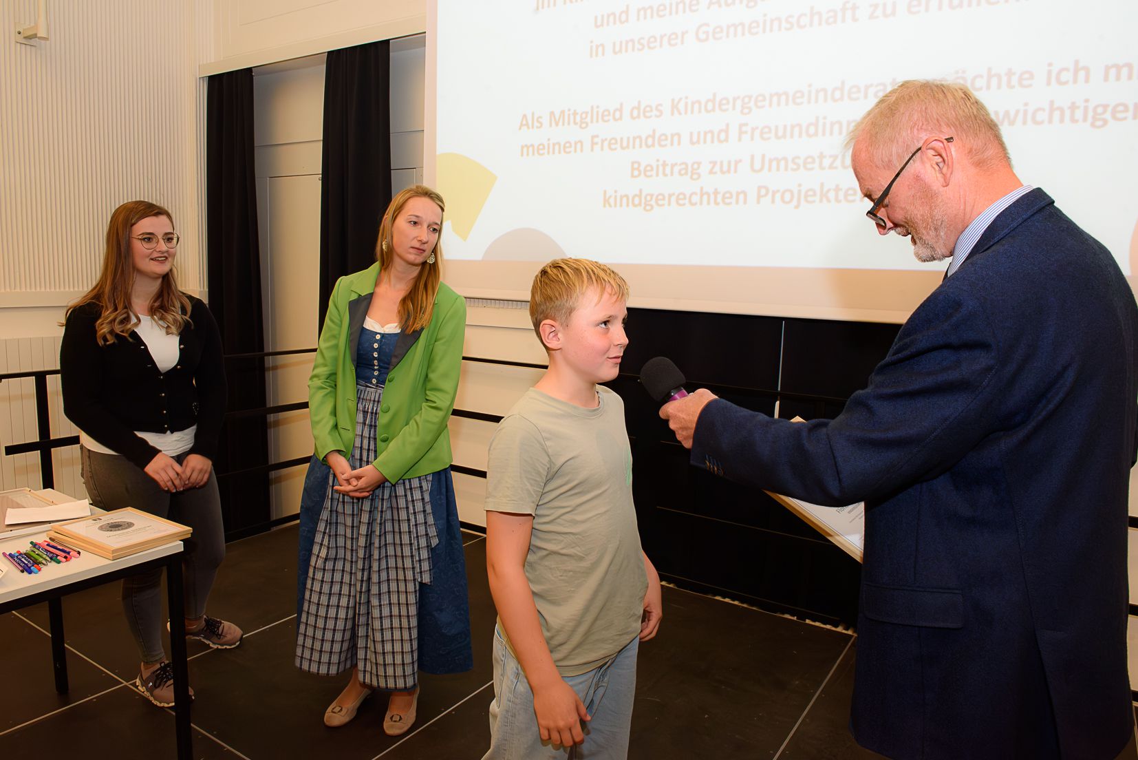 „Ich gelobe, meine Funktion und meine Aufgaben im Kindergemeinderat gewissenhaft zu beachten und meine Aufgaben uneigennützig in unserer Gemeinschaft zu erfüllen. Als Mitglied des Kindergemeinderats möchte ich mit meinen Freunden und Freundinnen einen wichtigen Beitrag zur Umsetzung von kindgerechten Projekten leisten.“ Bürgermeister Walter Schweighofer trug die Gelöbnisformel vor und bat danach jeden frischgebackenen Kindergemeinderat einzeln auf die Bühne, wo diese mit den Worten „ich gelobe“ und einem Handschlag ihre Ämter auch offiziell übertragen bekamen. „Ab jetzt gilt´s“, so die Worte des Bürgermeisters zu den jungen Gemeindevertretern.