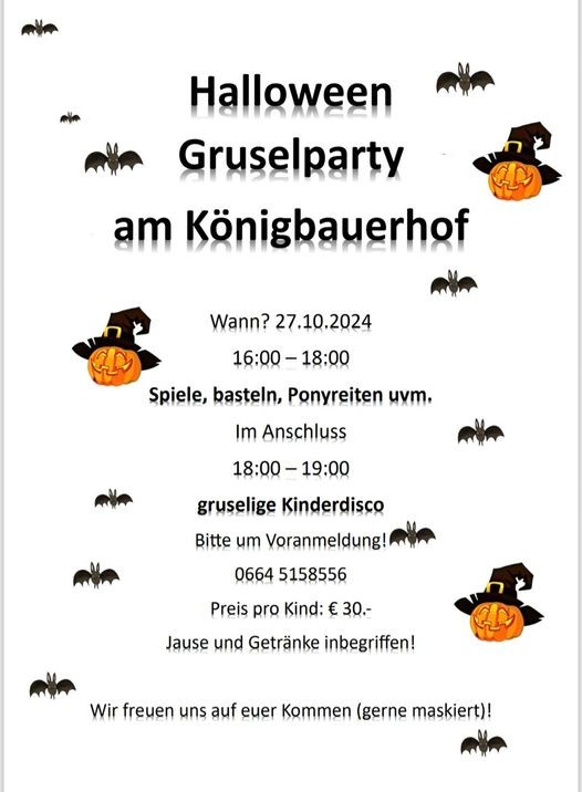 Der Königbauerhof lädt zu einer Hallweenparty ein. Von 16:00 bis 18:00 Uhr warten Spiele, Basteln, Ponyreiten und vieles mehr auf die Kinder. Anschließend gibt es von 18:00 bis 19:00 Uhr eine gruselige Kinderdisco. Preis pro Kind: € 30,- (inklusive Jause & Getränke)