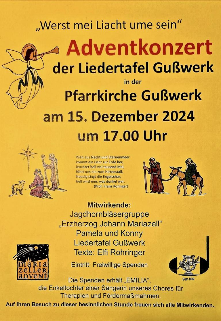 Zur Finanzierung von Therapien und Fördermaßmahmen für die Enkeltochter einer Sängerin des Chores fand im Rahmen des Mariazeller Advents am 15. Dezember 2024, dem dritten Adventsonntag „Gaudete“, in der Pfarrkirche Gußwerk ein Benefiz-Adventkonzert statt. Unter dem Motto – „Werst mei Liacht ume sein“ gestaltete die Liedertafel Gußwerk unter der Chorleitung von Catharina Blaauwendraad diesen Abend für das Projekt „EMILIA“, ein schwer erkranktes Mädchen aus dem Mariazeller Land.