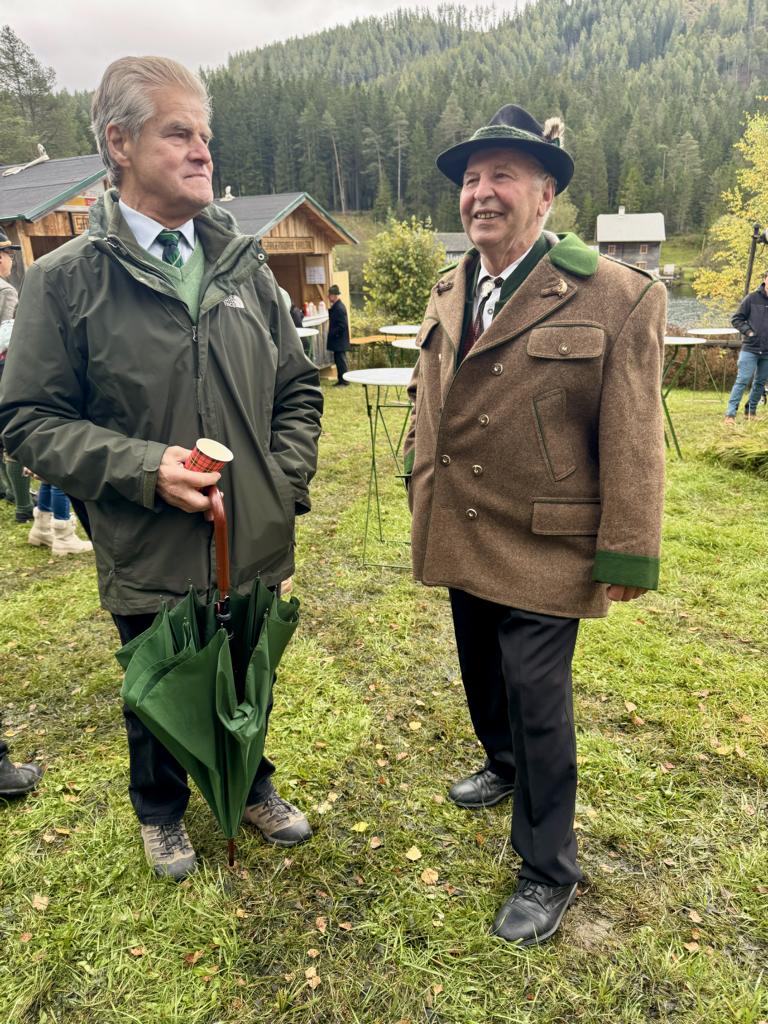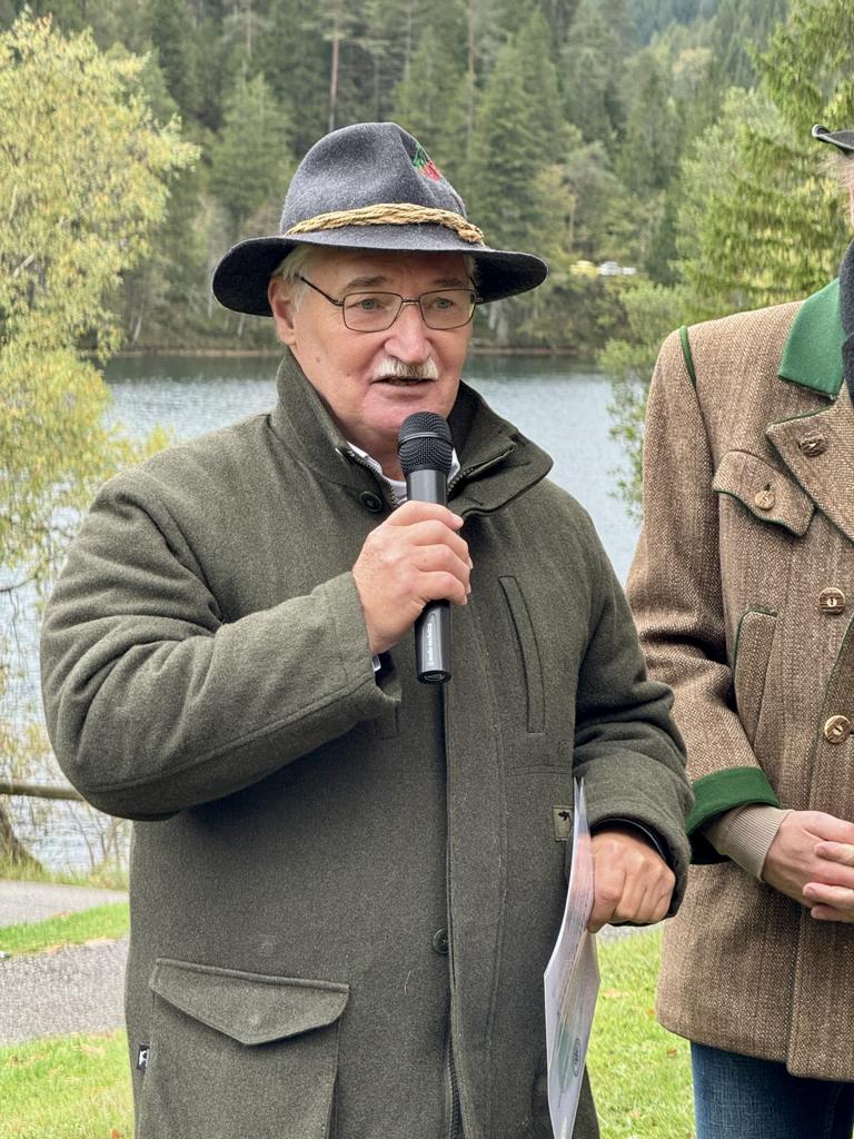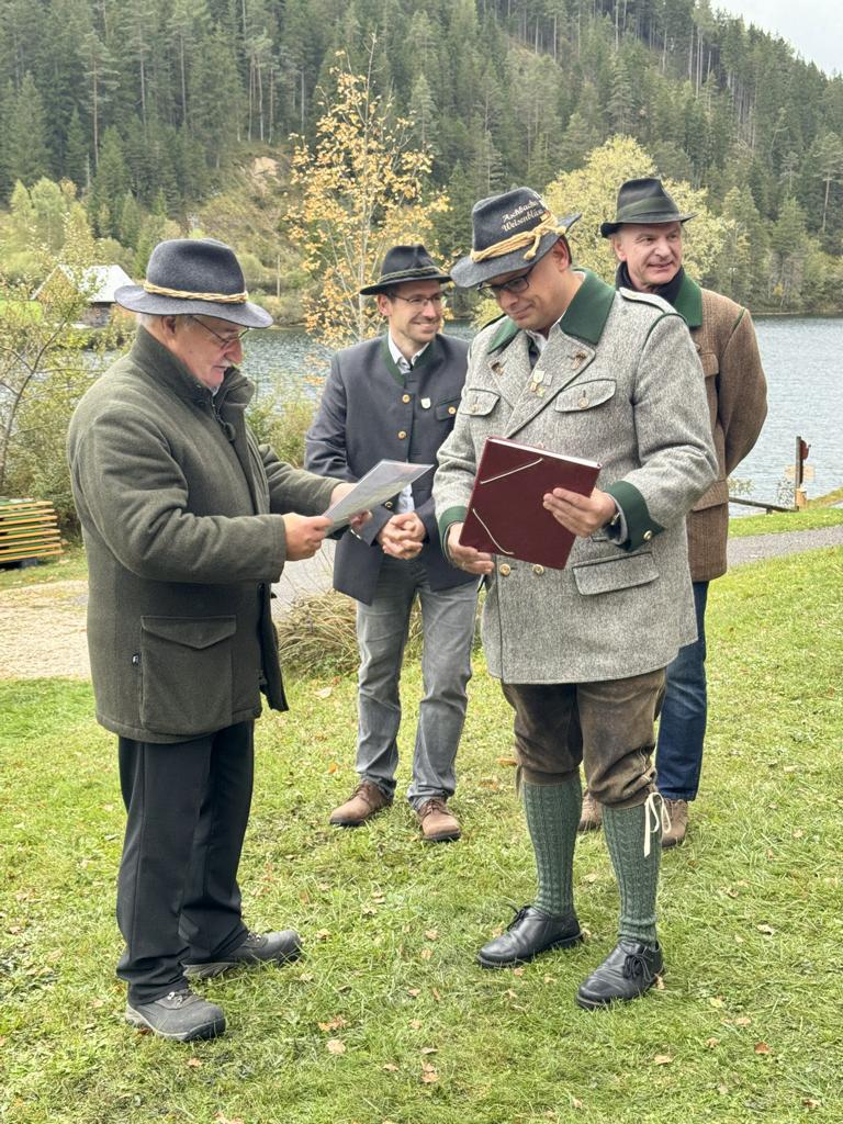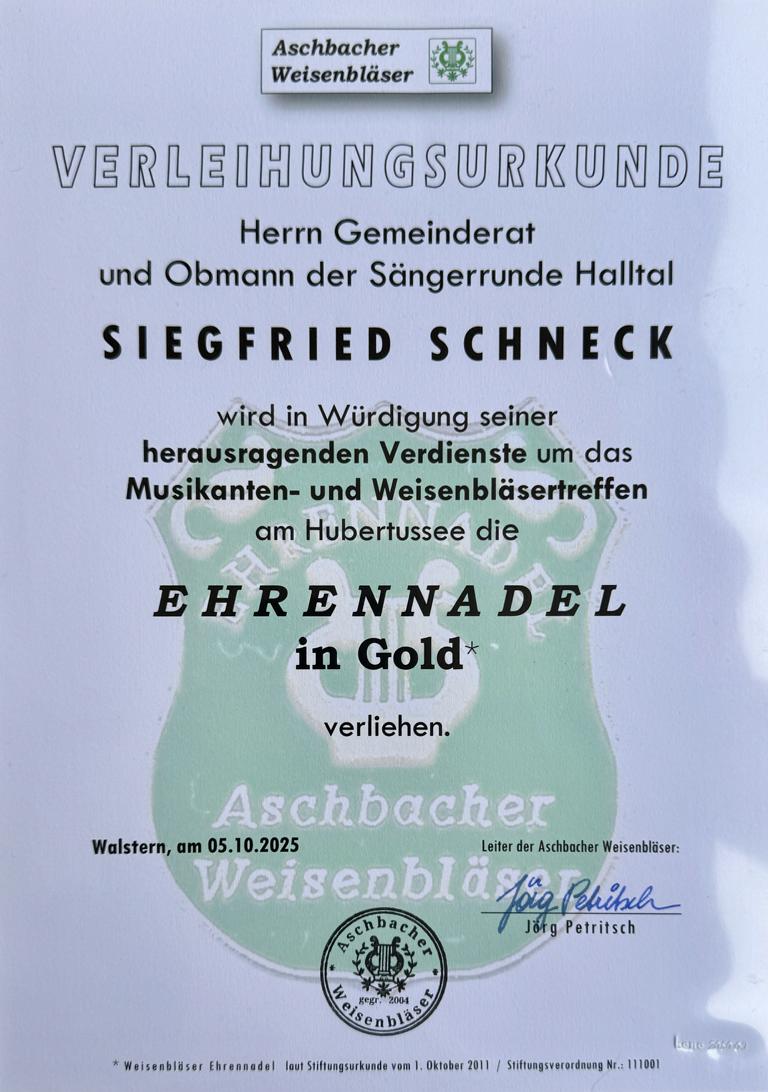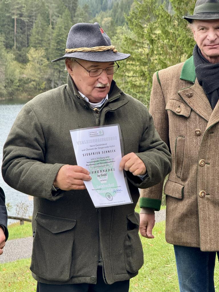 Der Gemeinderat und Obmann der Sängerrunde Halltal Siegfried Schneck erhielt in Würdigung seiner herausragenden Verdienste um das seit nunmehr 20 Jahren bestehende Musikanten- und Weisenbläsertreffen am Hubertussee von den Aschbacher Weisenbläsern die Ehrennadel in Gold verliehen. Kapellmeister Jörg Petritsch überreichte im Beisein von Bürgermeister Helmut Schweiger und dem zweiten Vizebürgermeister Fabian Fluch diese Auszeichnung mit einer kurzen, aber herzlichen Ansprache. Für „Siegi“ war es eine sehr große Freude und auch eine Überraschung. „Ich werde diese Goldene Ehrennadel mit allen Helferinnen und Helfern, die für das Gelingen verantwortlich waren, teilen“, sagte er in seiner Dankesrede.