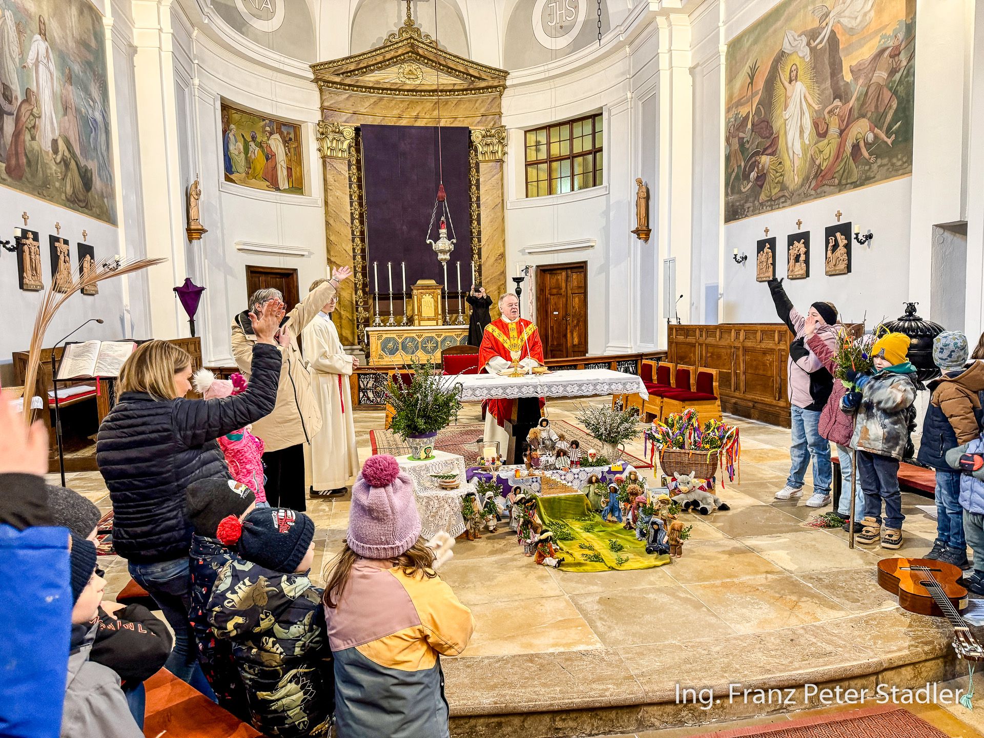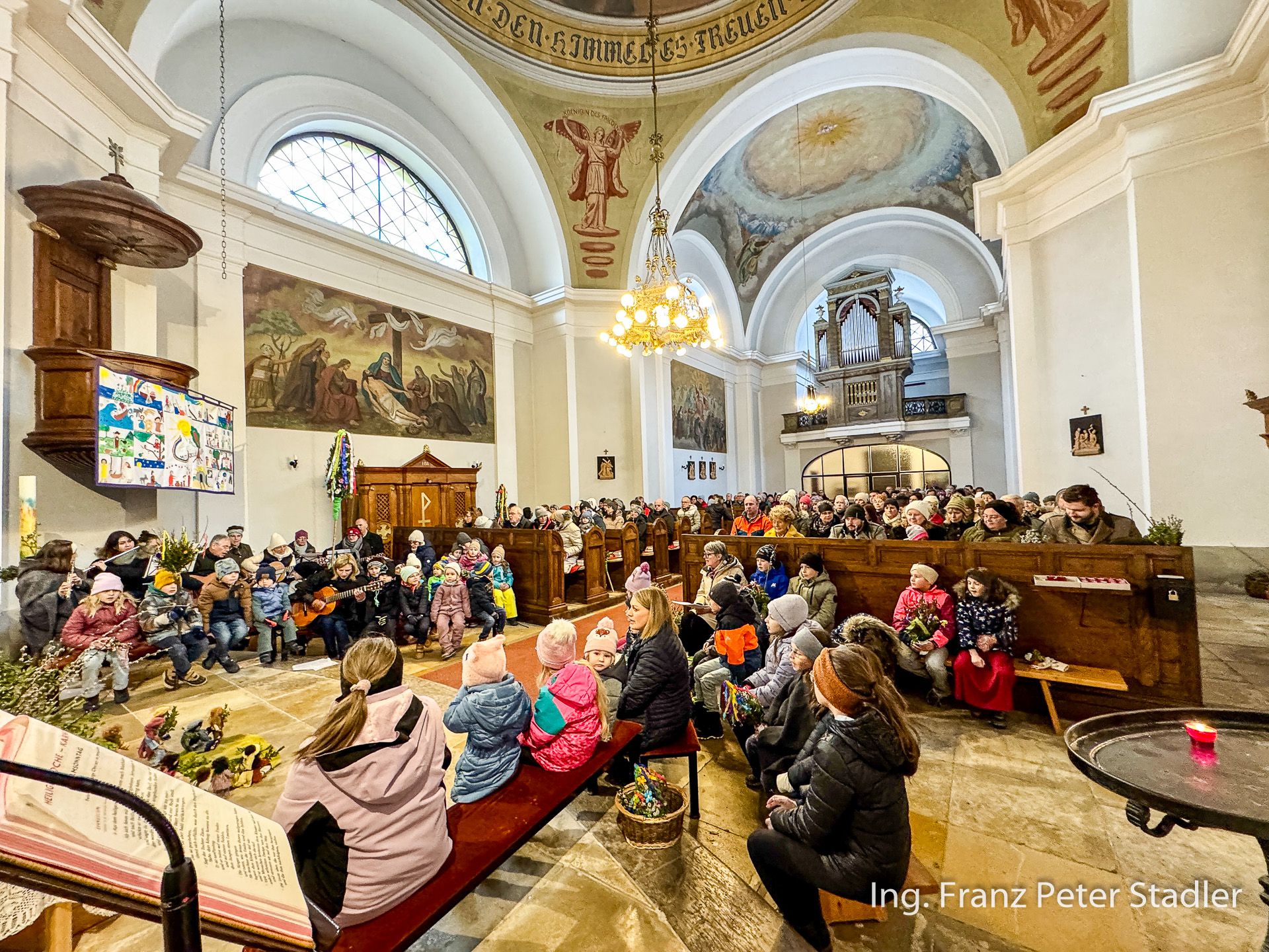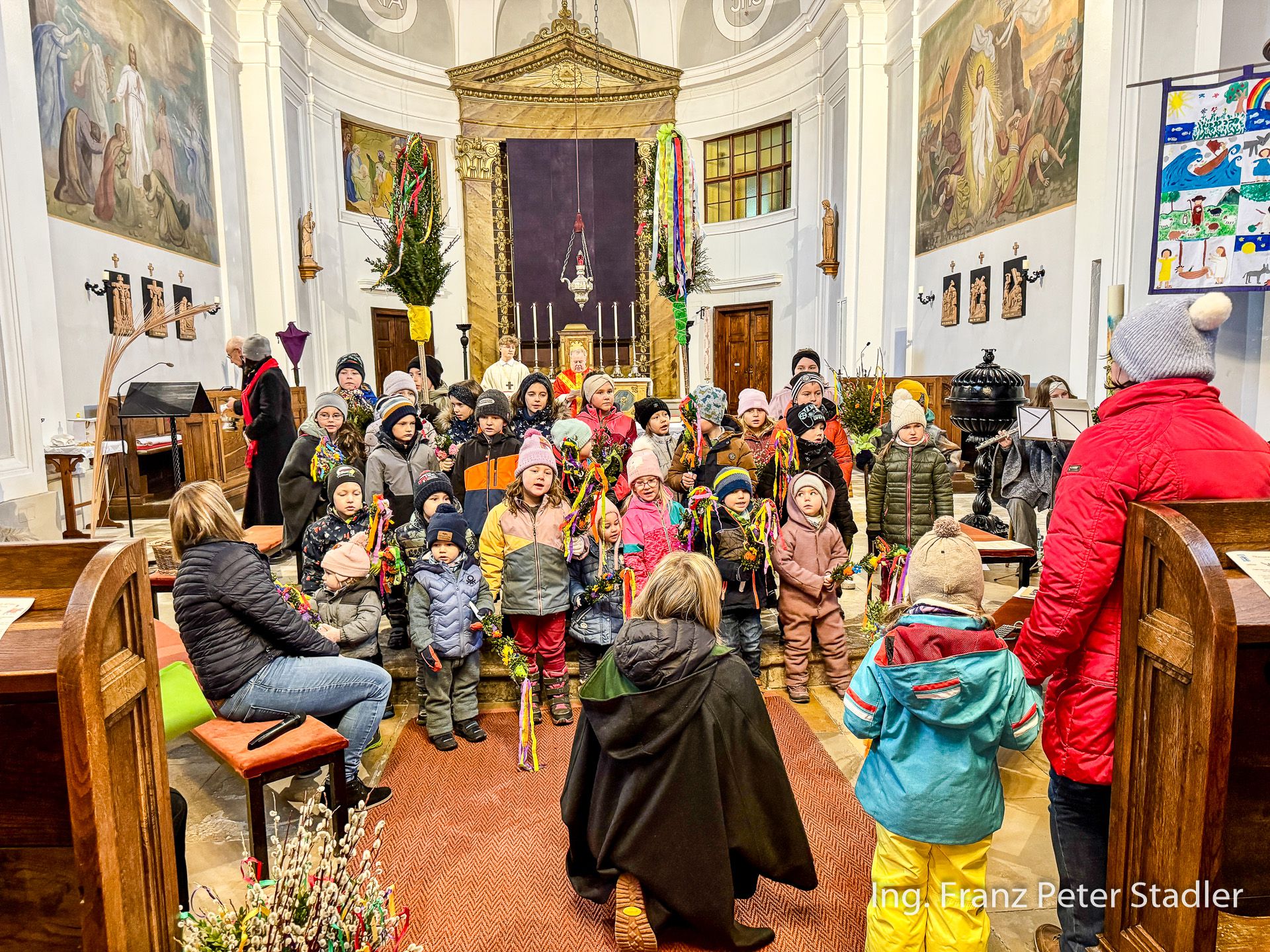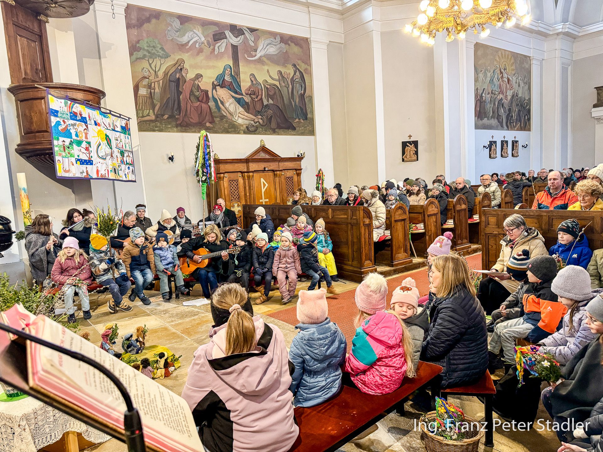 Von dort ging dann die Gußwerker Palmprozession auf kurzem Wege in die Pfarrkirche, die für die vielen Besucherinnen und Besucher des Gottesdienstes beinahe zu klein wurde. Die Kinder des Kindergartens gestalteten unter der Leitung von Nicole Fluch mit vielen MusikerInnen die Umrahmung sowohl der Segnung der Palmzweige im Rüsthaus als auch nach dem Einzug auch die Messe zum Palmsonntag.