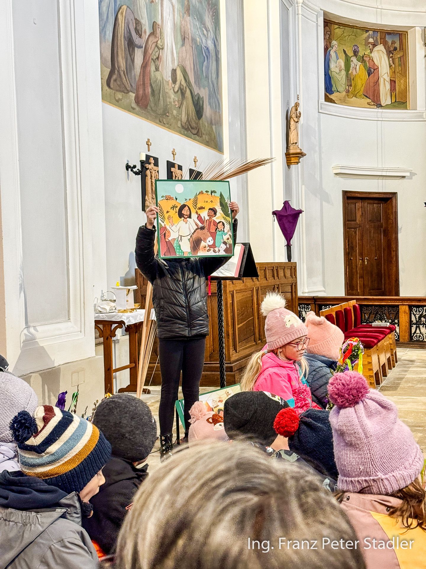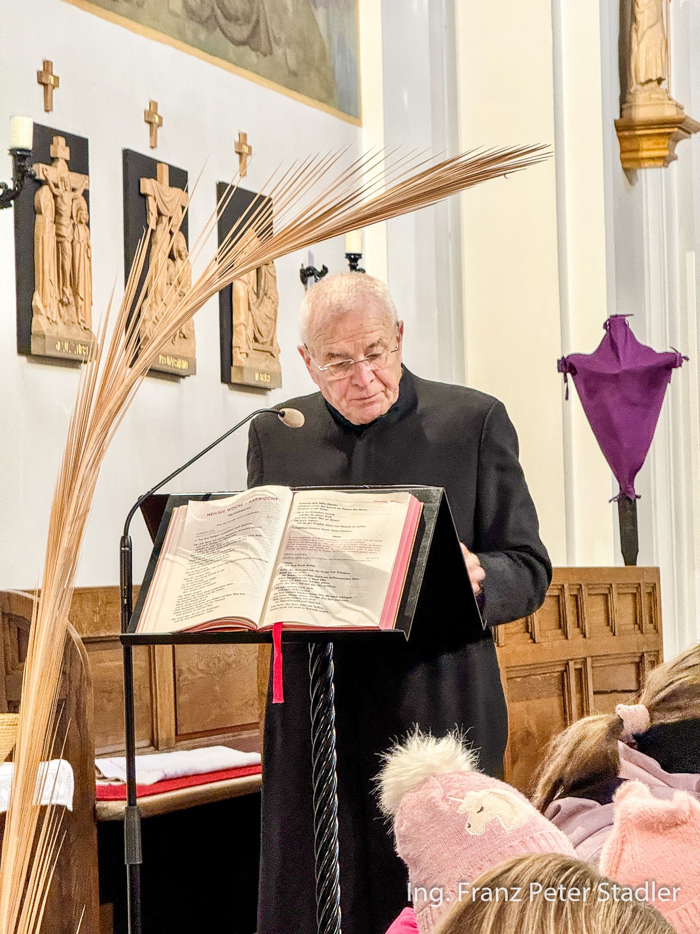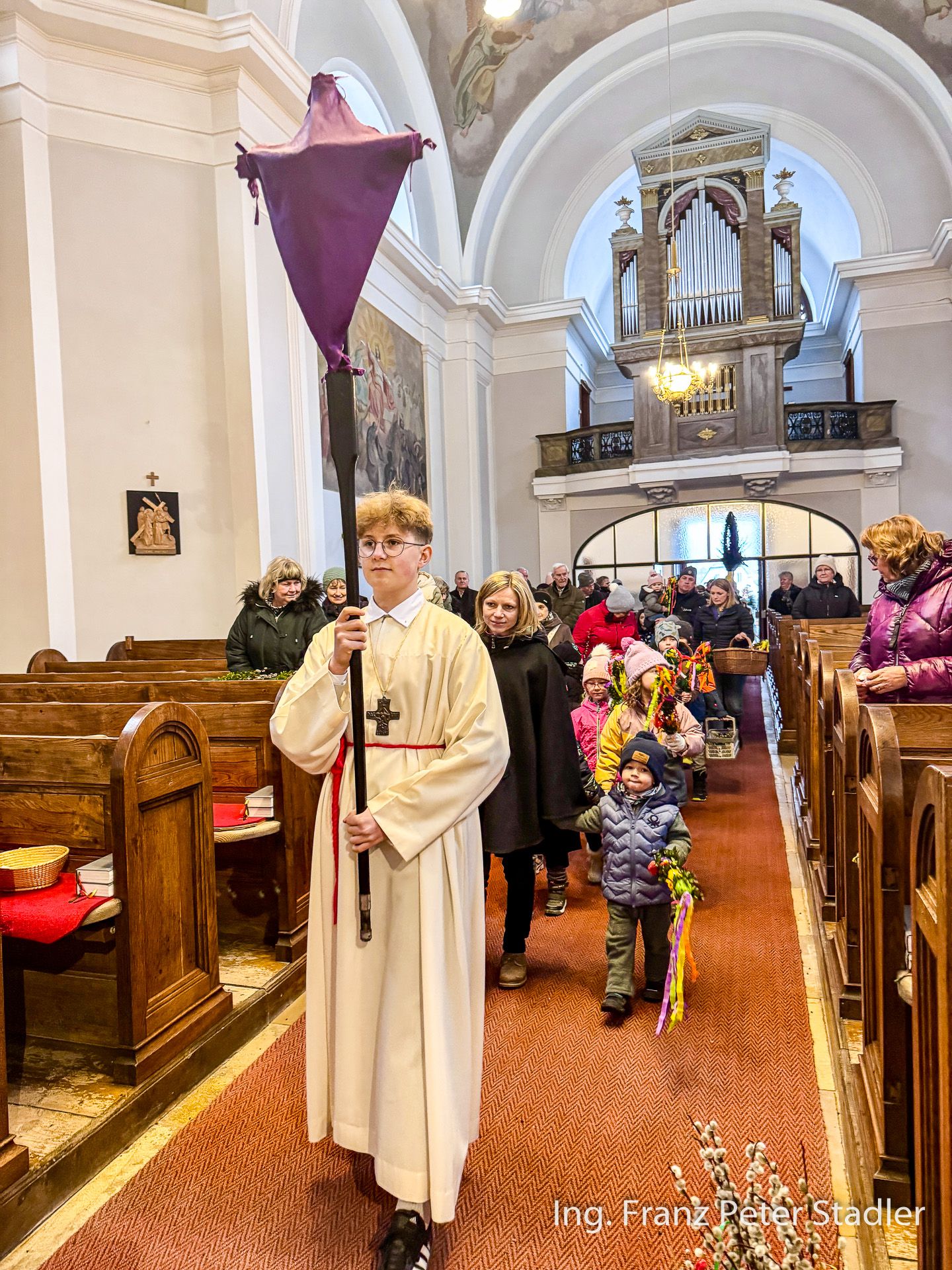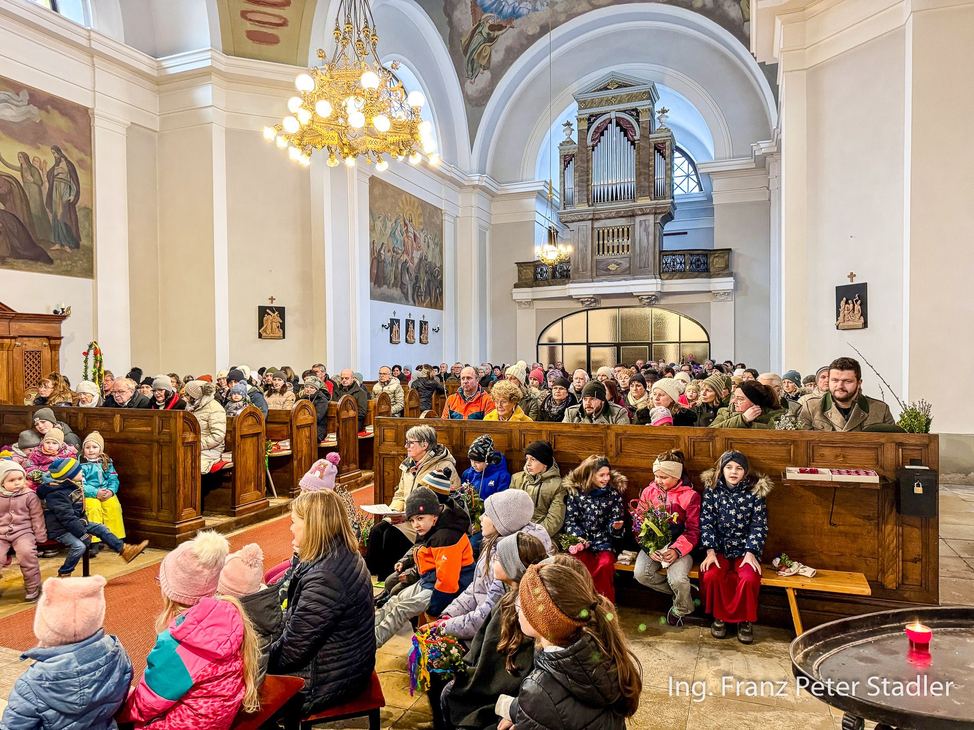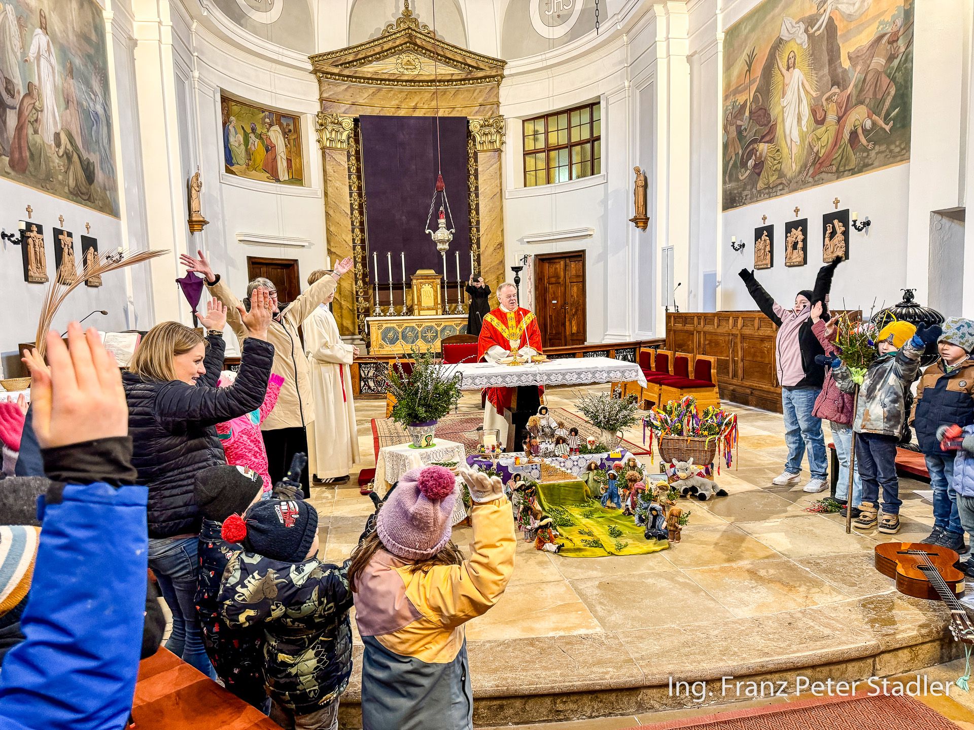 Von dort ging dann die Gußwerker Palmprozession auf kurzem Wege in die Pfarrkirche, die für die vielen Besucherinnen und Besucher des Gottesdienstes beinahe zu klein wurde. Die Kinder des Kindergartens gestalteten unter der Leitung von Nicole Fluch mit vielen MusikerInnen die Umrahmung sowohl der Segnung der Palmzweige im Rüsthaus als auch nach dem Einzug auch die Messe zum Palmsonntag.