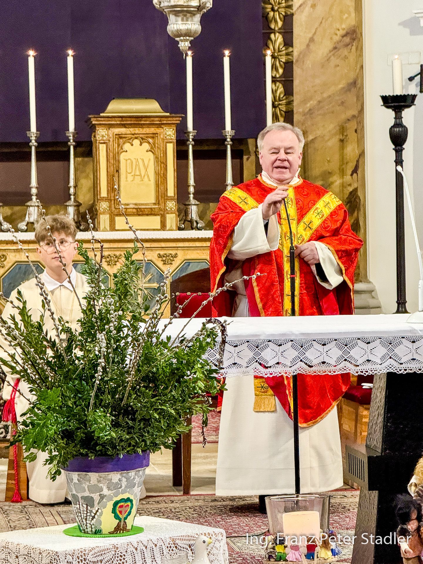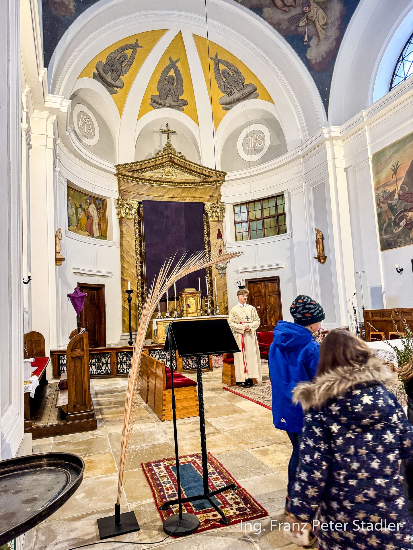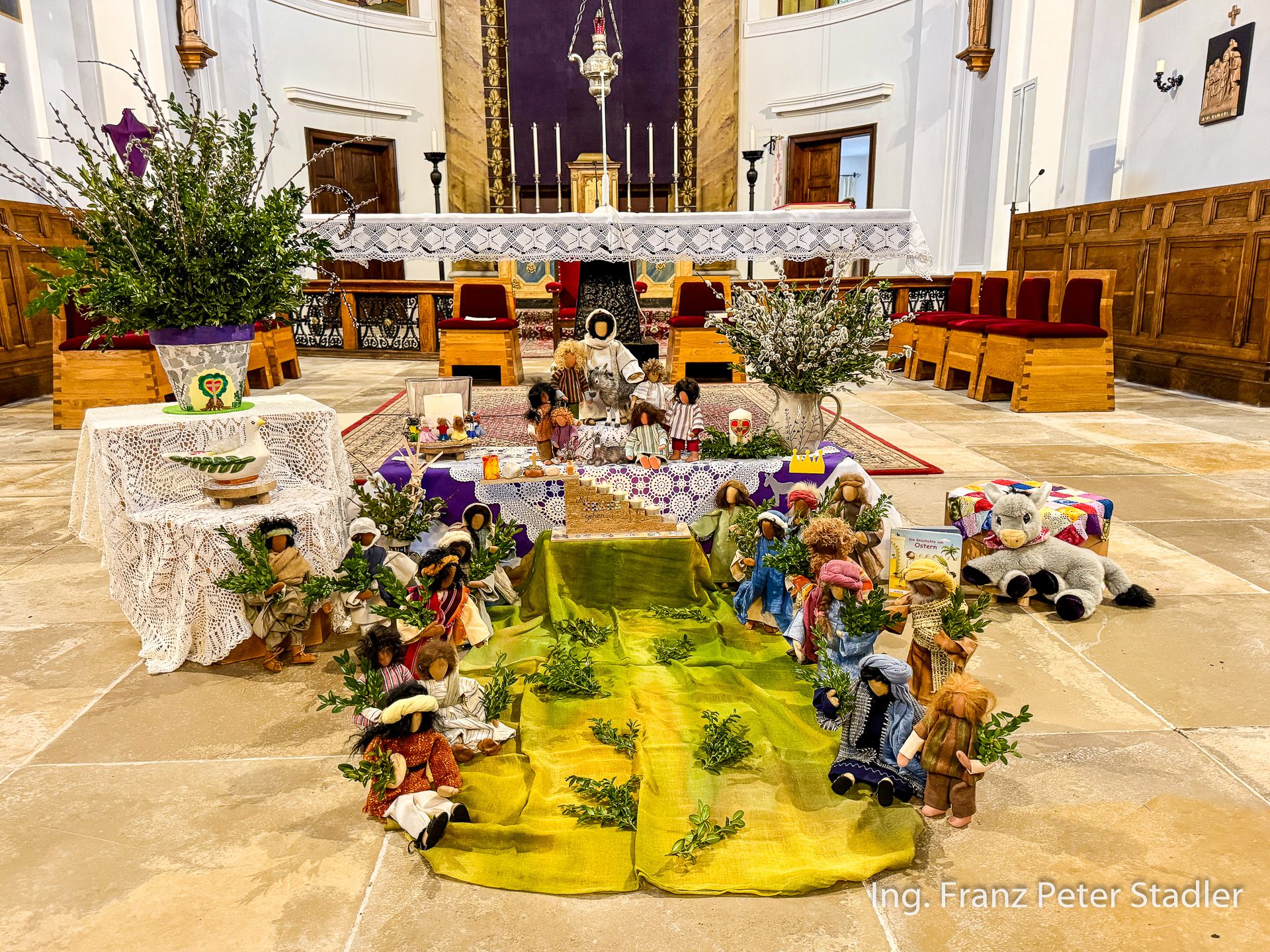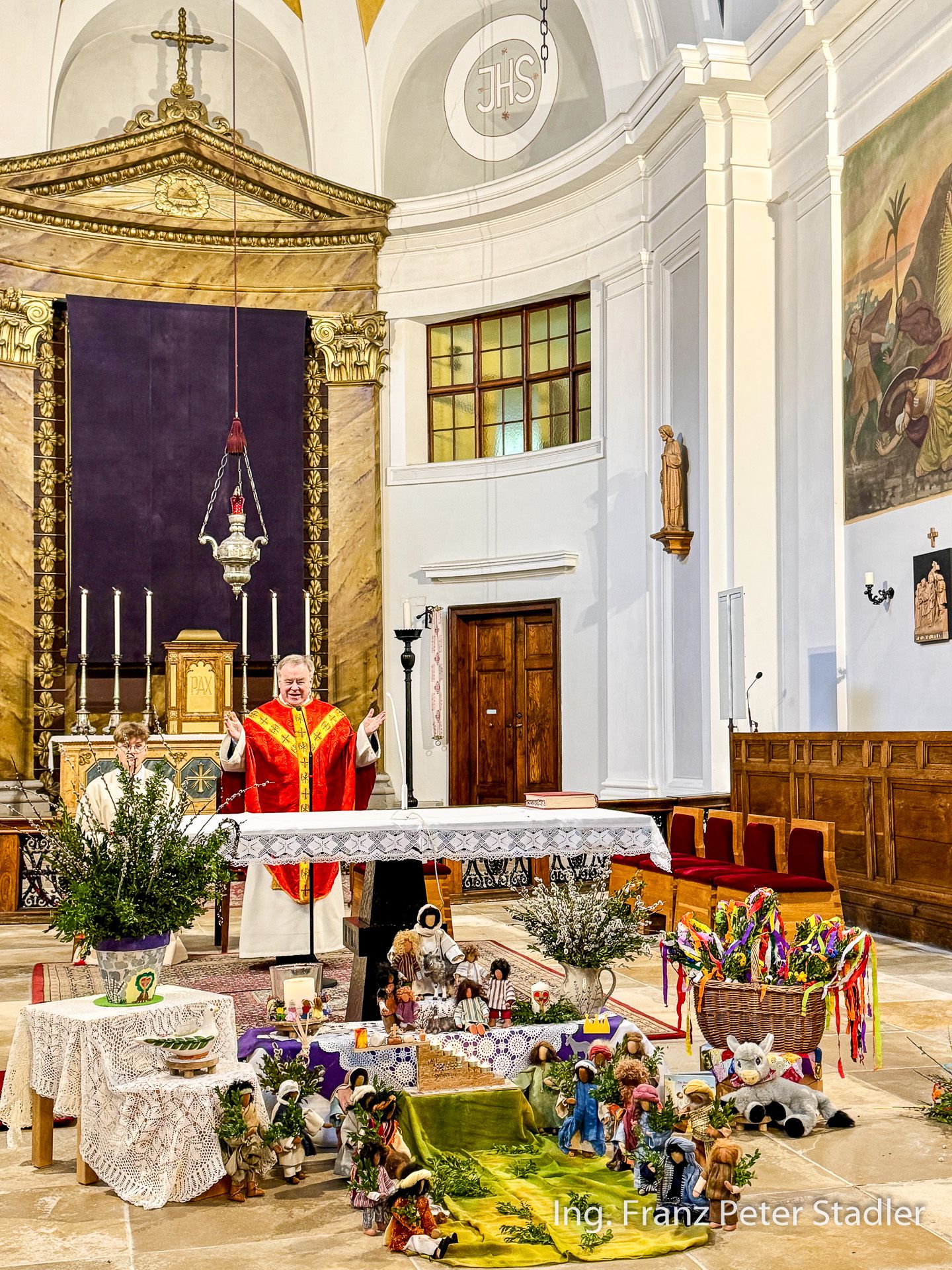 Von dort ging dann die Gußwerker Palmprozession auf kurzem Wege in die Pfarrkirche, die für die vielen Besucherinnen und Besucher des Gottesdienstes beinahe zu klein wurde. Die Kinder des Kindergartens gestalteten unter der Leitung von Nicole Fluch mit vielen MusikerInnen die Umrahmung sowohl der Segnung der Palmzweige im Rüsthaus als auch nach dem Einzug auch die Messe zum Palmsonntag.