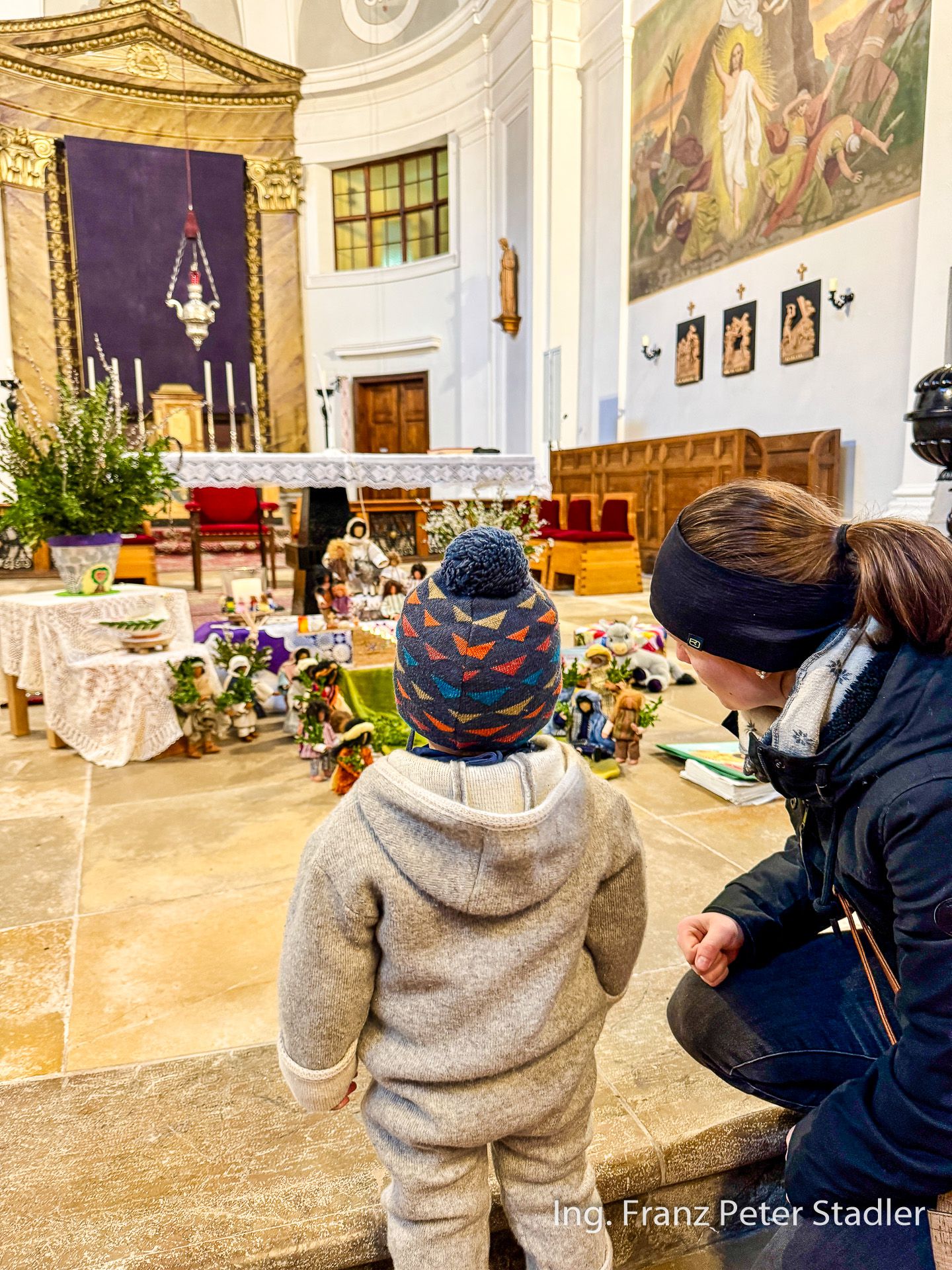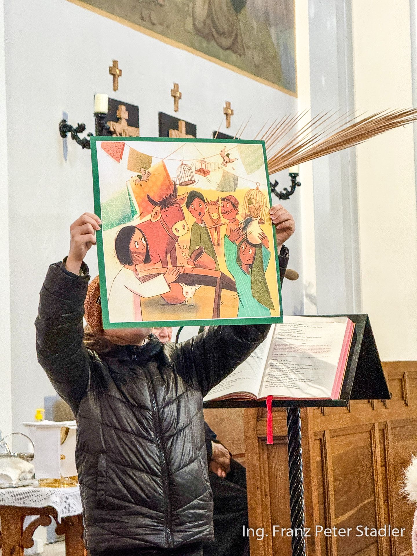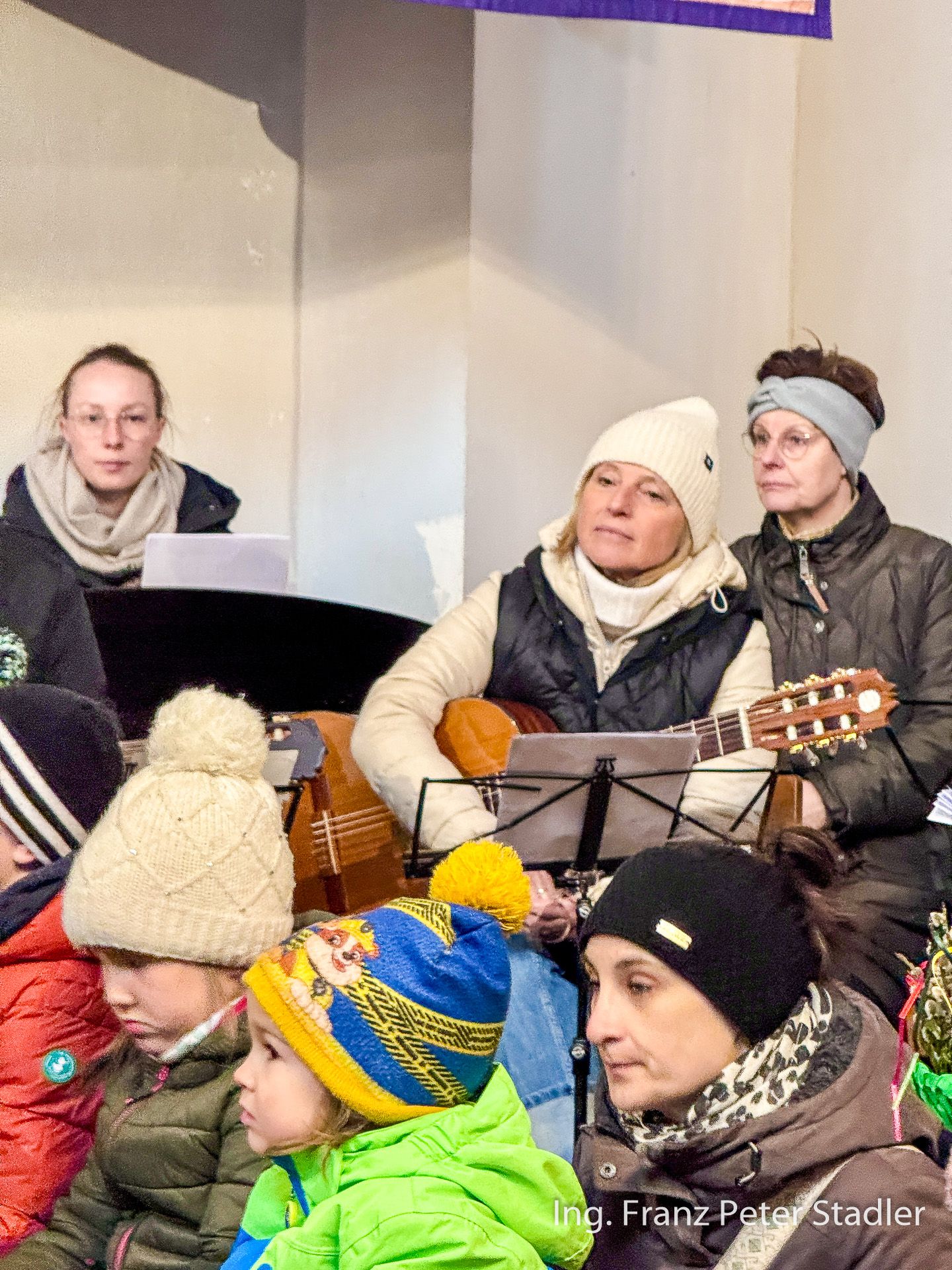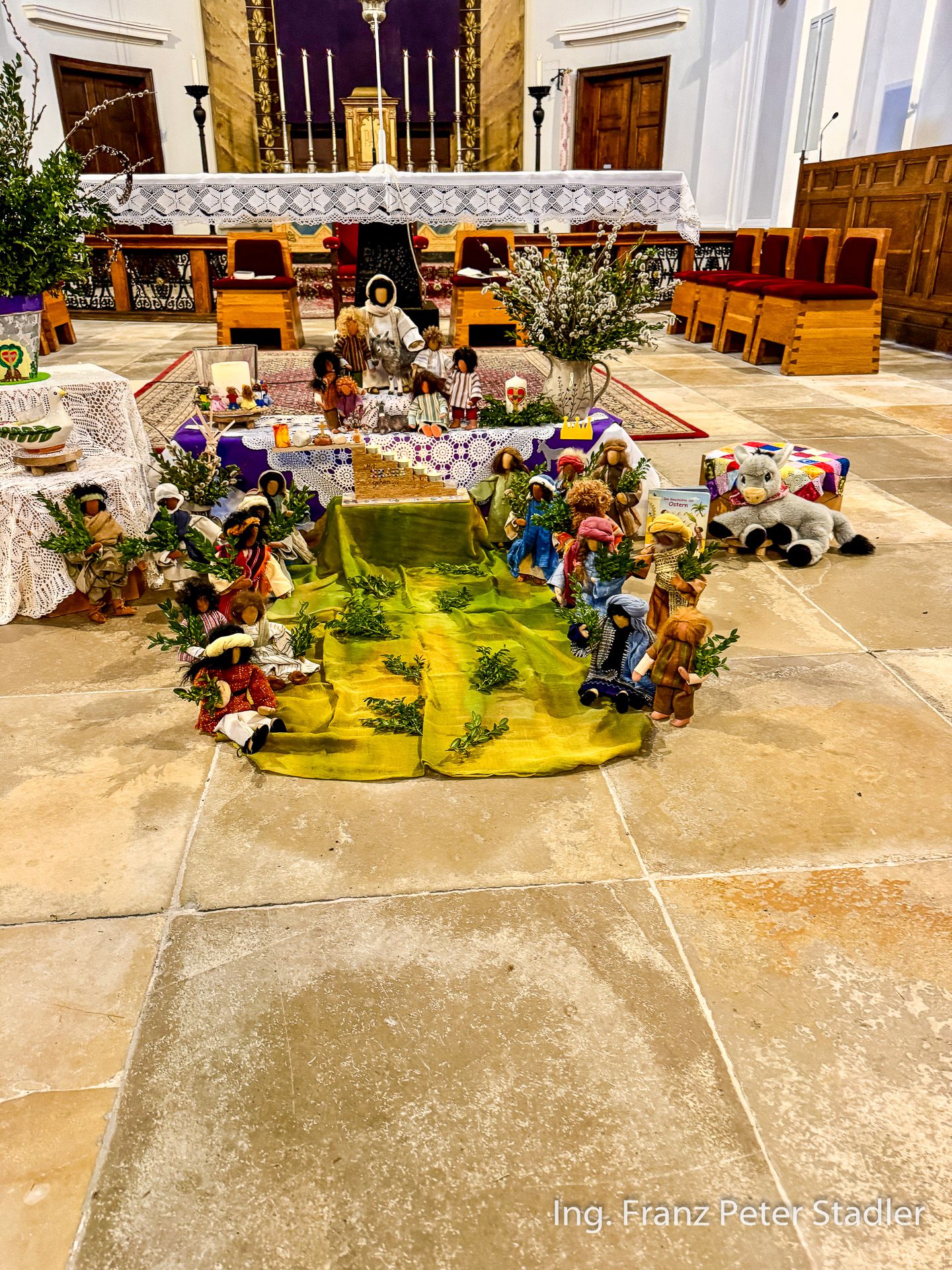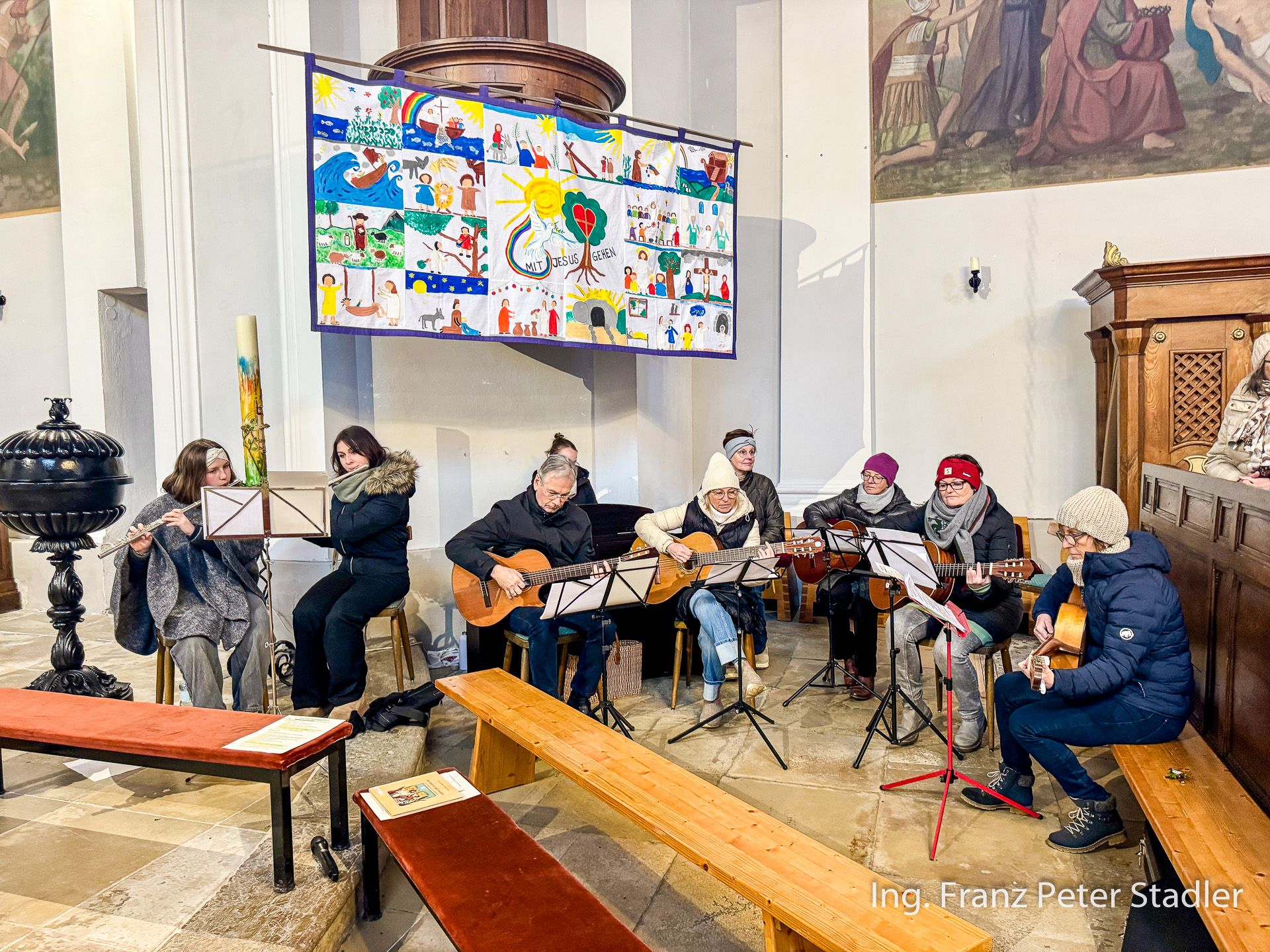 Von dort ging dann die Gußwerker Palmprozession auf kurzem Wege in die Pfarrkirche, die für die vielen Besucherinnen und Besucher des Gottesdienstes beinahe zu klein wurde. Die Kinder des Kindergartens gestalteten unter der Leitung von Nicole Fluch mit vielen MusikerInnen die Umrahmung sowohl der Segnung der Palmzweige im Rüsthaus als auch nach dem Einzug auch die Messe zum Palmsonntag.