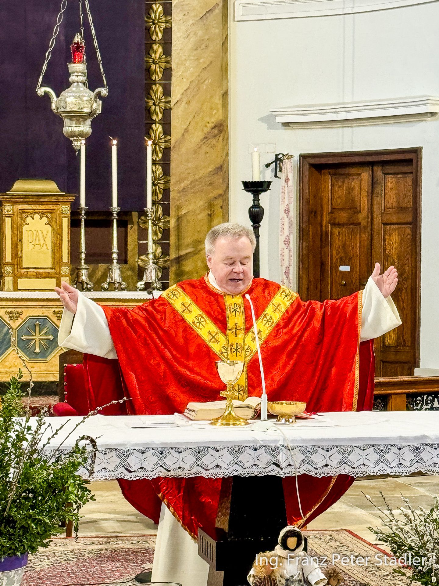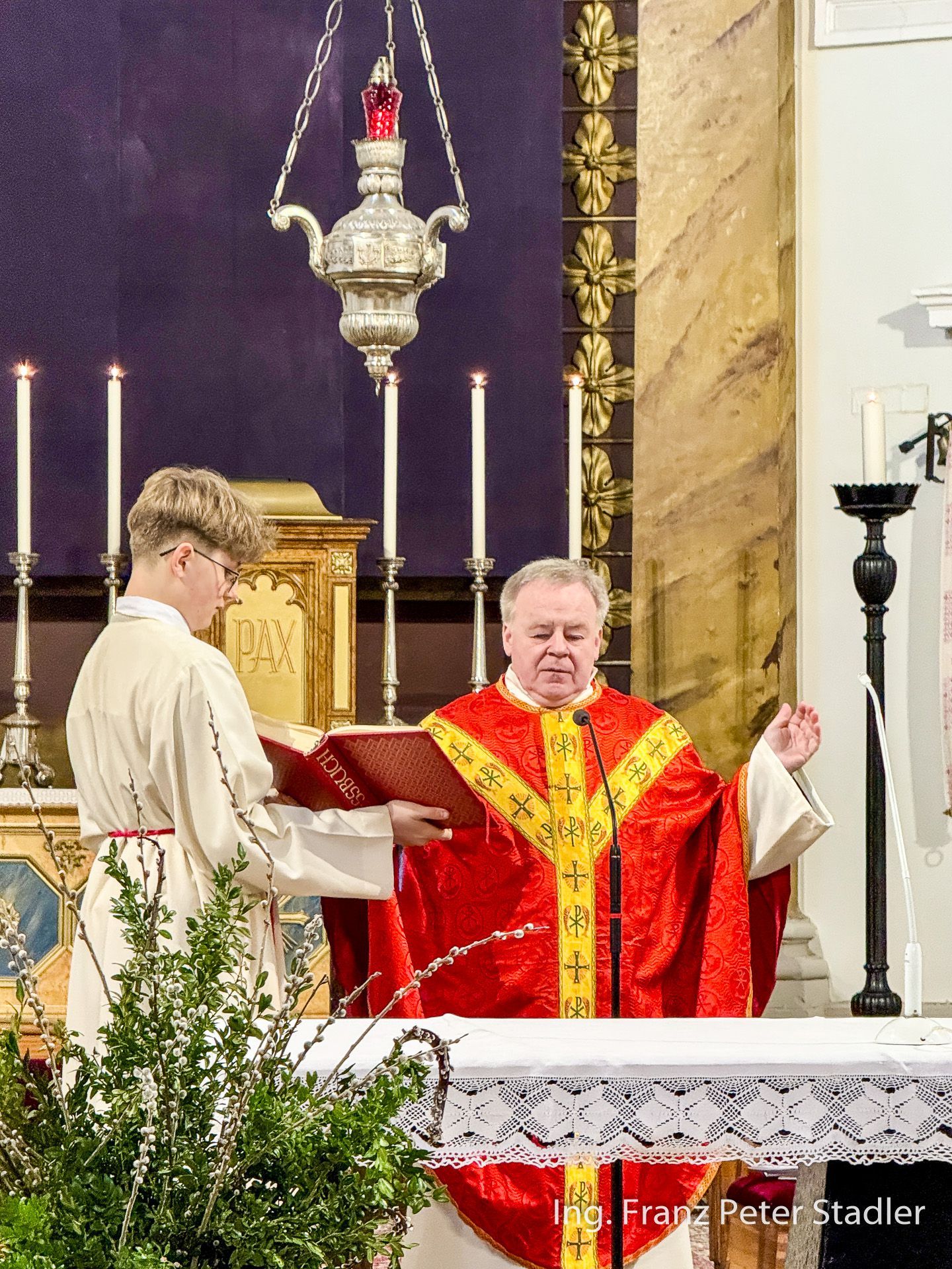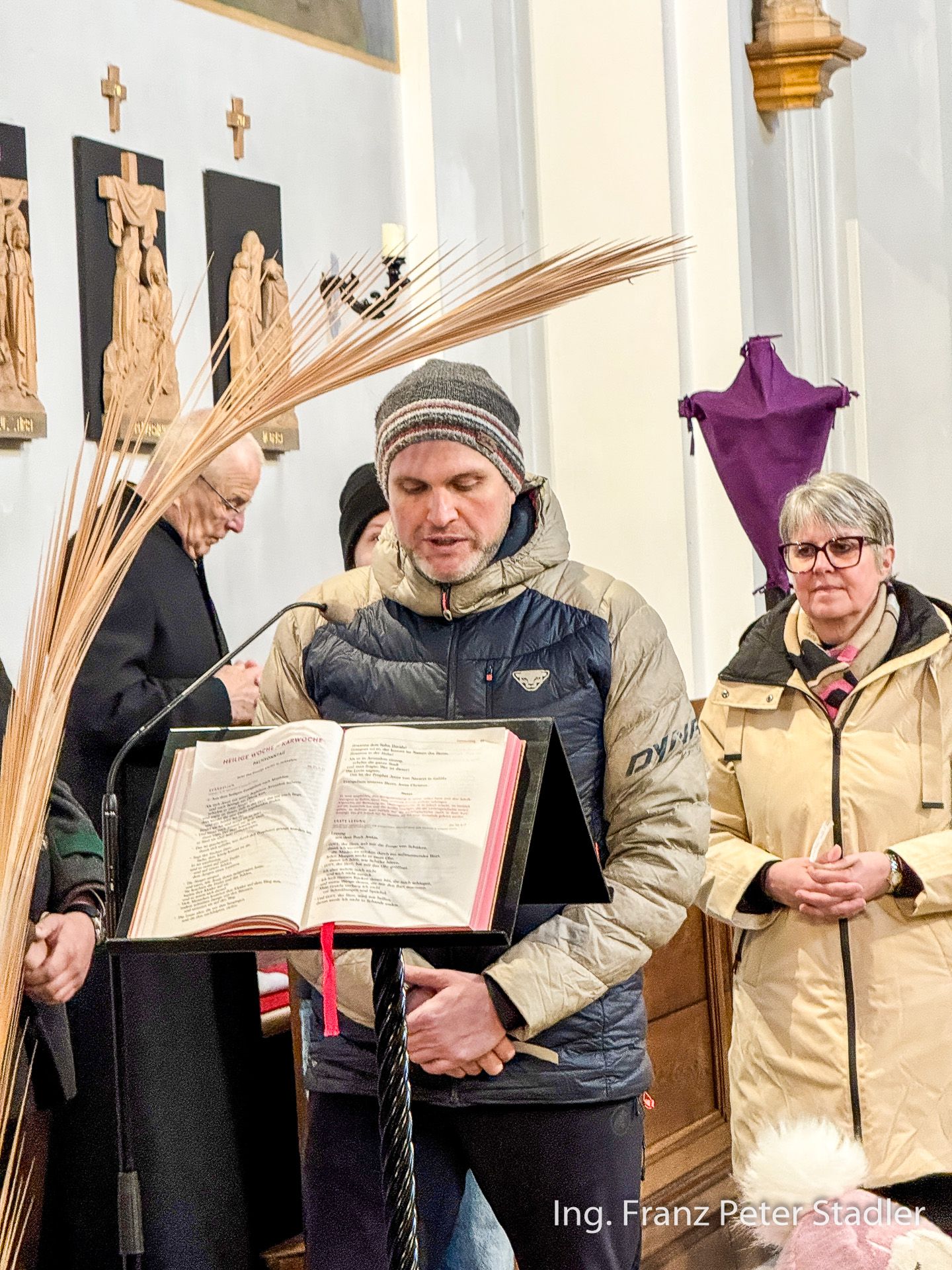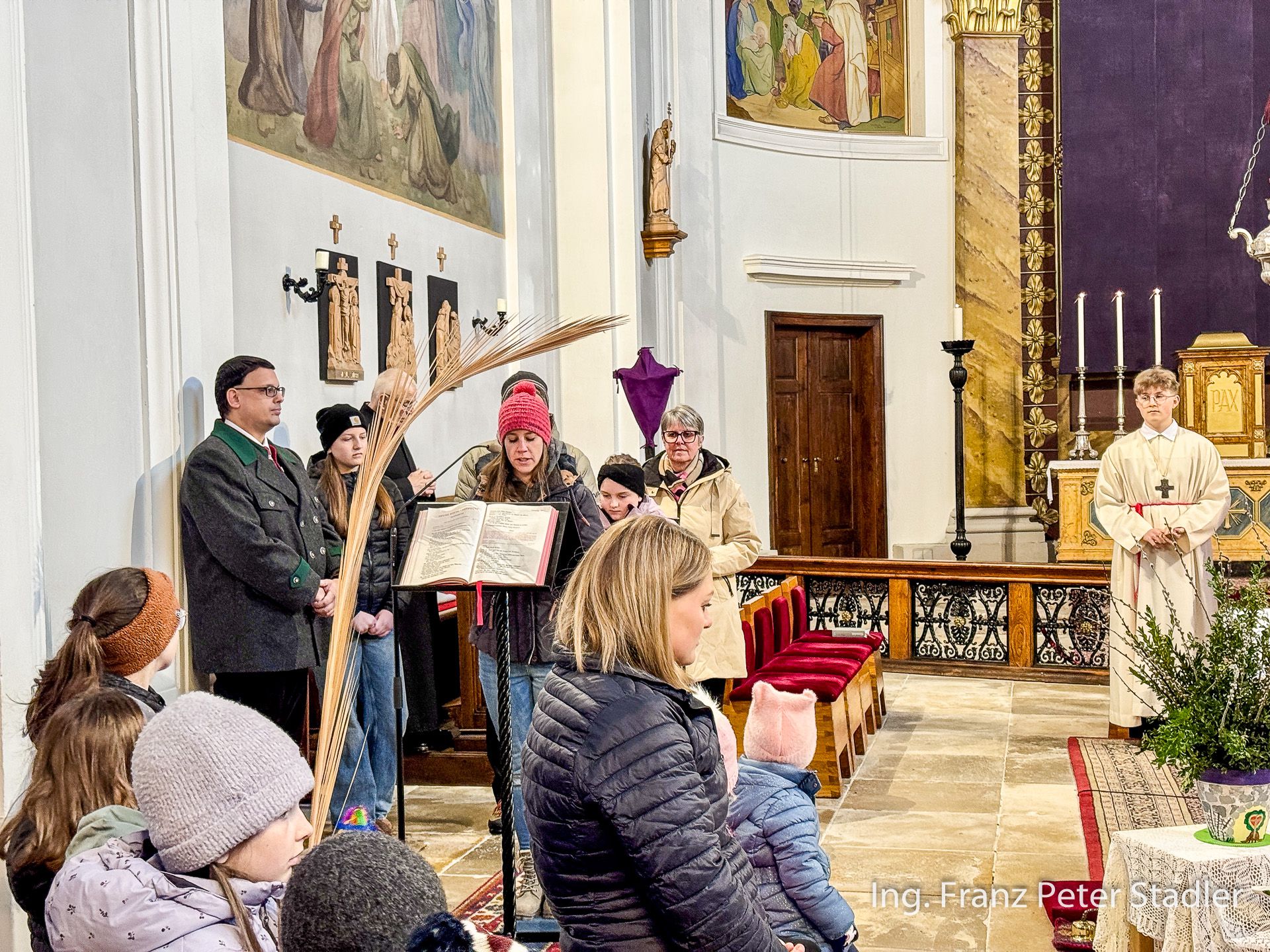 Bei der Segnung der Palmzweige unterstützte auch eine Abordnung der Aschbacher MusikantInnen die würdige Feierlichkeit. Die Messfeier wurde vom Mariazeller Superior Pater Dr. Michael Staberl zelebriert und das Evangelium, die Passion, wurde von Nicole Fluch vorgetragen und mit Medidationsbildern begleitet.