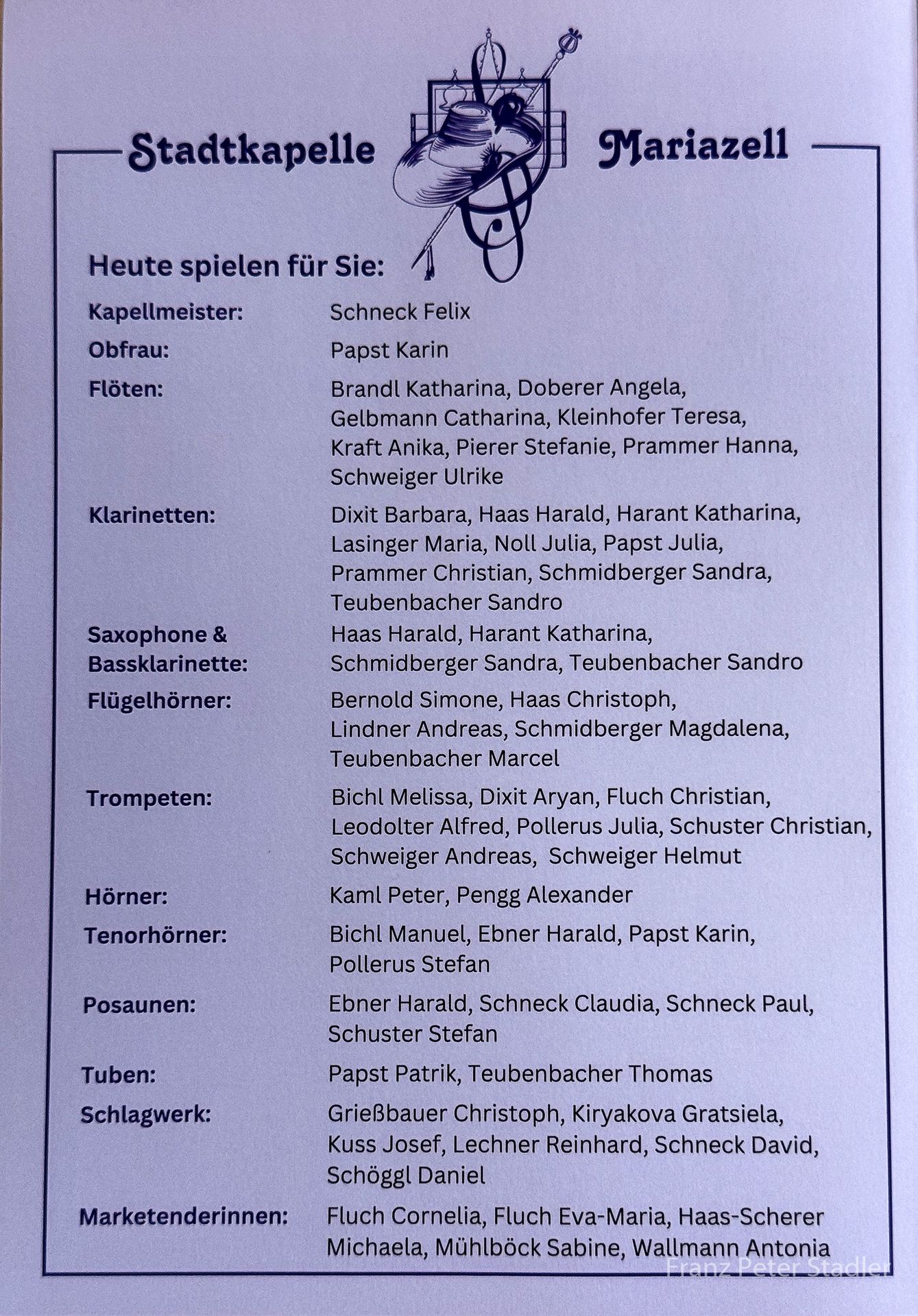 Bürgermeister Helmut Schweiger der Stadtgemeinde Mariazell mit seiner Gattin, Vizebürgermeister Walter Schweighofer der Stadtgemeinde Mariazell mit seiner Gattin, der Mitterbacher Bürgermeister Thomas Teubenbacher, die Bezirksobfrau des Steirischen Blasmusikverbands Sabine Maßer mit ihrer Begleitung, Musikschuldirektor Magister Hannes Haider mit Gattin, Mag. Bernhard Widlhofer von der Apotheke der Gnadenmutter in Mariazell, um nur einige aufzuzählen.
