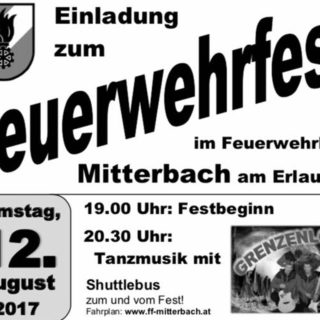 Die Freiwillige Feuerwehr Mitterbach am Erlaufsee lädt auch heuer wieder recht herzlich zu ihrem zweitägigen Feuerwehrfest ein. In diesem Jahr findet das Fest am Samstag, 12. und Sonntag, 13. August 2017 im Feuerwehrhaus (Seestraße...