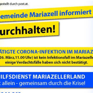 DIESER BEITRAG IST VERALTET – HIER FINDEN SIE DIE AKTUELLE VERSION Der Bürgermeister der Stadtgemeinde Mariazell ersucht um Veröffentlichung nachstehender Informationen: KEINE BESTÄTIGTE CORONAINFEKTION IM MARIAZELLERLAND Nach Mitteilung der Sanitätsbehörde sind derzeit (Stand 2....
