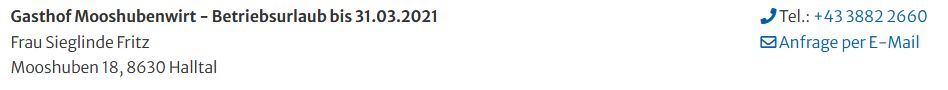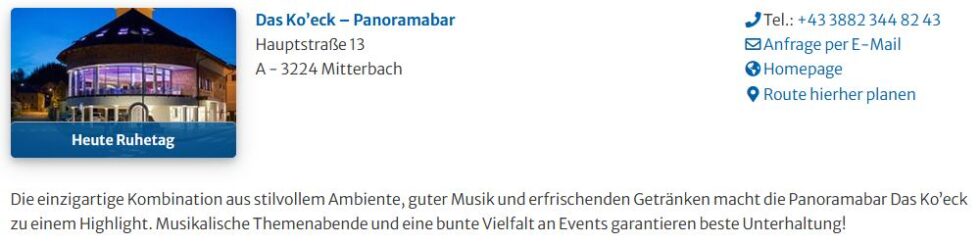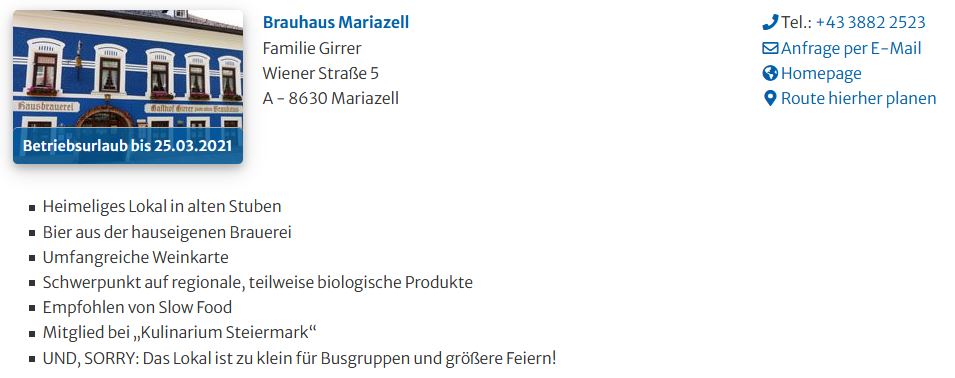 In den Auflistungen von Gastronomie- und Beherbergungsbetrieben auf Mariazell-Online besteht die Möglichkeit auf Urlaubssperren und Ruhetage hinzuweisen. Der Gast kann damit bereits in der Gastronomie- und Quartierübersicht auf www.mariazell.at sofort erkennen, welcher Betrieb heute Ruhetag oder derzeit Urlaubssperre hat. Der Eintrag des Betriebes bleibt dabei selbstverständlich weiterhin aufgelistet, es erfolgt lediglich eine entsprechende Kennzeichnung des Eintrags mit einer entsprechenden Einblendung im Bild.