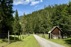 Eine gemütliche Wanderung führt vom Ausgangspunkt Franzbauer im Salzatal über eine Forststraße auf den Hals („Christkindl“-Hals).