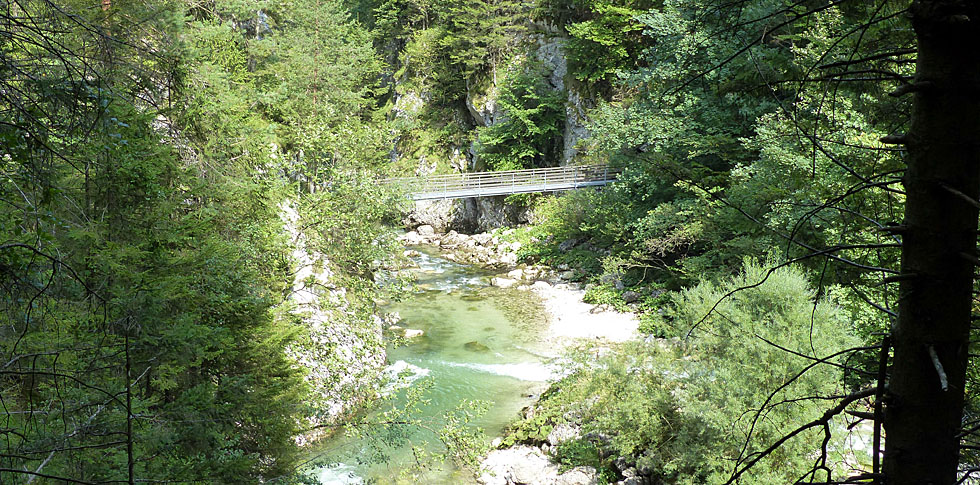 Nach etwa 30 Minuten führt eine Brücke über die Erlauf zur „Teufelskirche“, einem pyramidenförmigen, ausgehöhlten Felsturm – diesen Abstecher (Hin- und Rückweg jeweils ca. 15 Minuten) sollten Sie nicht versäumen.