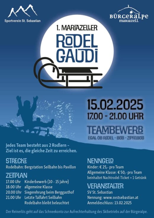 Am Samstag, 15. Februar 2024 findet die 1. Mariazeller Rodel Gaudi auf der Rodelbahn der Mariazeller Bürgeralpe statt.