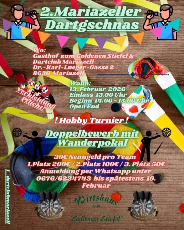 Am Freitag, 13. Februar 2026 findet ab 13:00 Uhr der 2. Mariazeller Dartgschnas beim Gasthof zum Goldenen Stiefel statt.