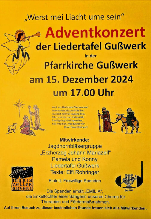 Am Sonntag, 15. Dezember 2024 lädt die Liedertafel zu einem stimmungsvollen Adventkonzert in der Pfarrkirche Gußwerk ein.