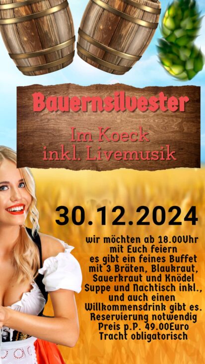 Am 30. Dezember 2024 wird ab 18:00 Uhr im Koeck Bauernsilvester gefeiert, Feines Buffet inkl. Willkommensdrink und Livemusik um € 49,- pro Person.