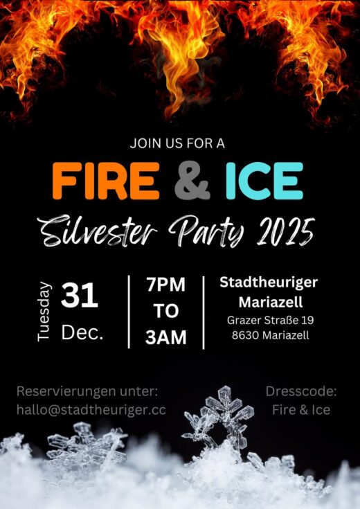 Unter dem Motto „Fire & Ice“ findet am 31. Dezember 2024 ab 19:00 Uhr eine Silvester Party statt. Ein Abend voller Genuss, Stimmung und unvergesslicher Momente wartet auf Sie. Reservierungen unter hallo@stadtheuriger.cc