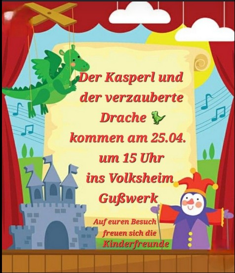 Am Freitag, 25. April 2025 kommt der Kasperl und der verzauberte Drache ins Volksheim Gußwerk.