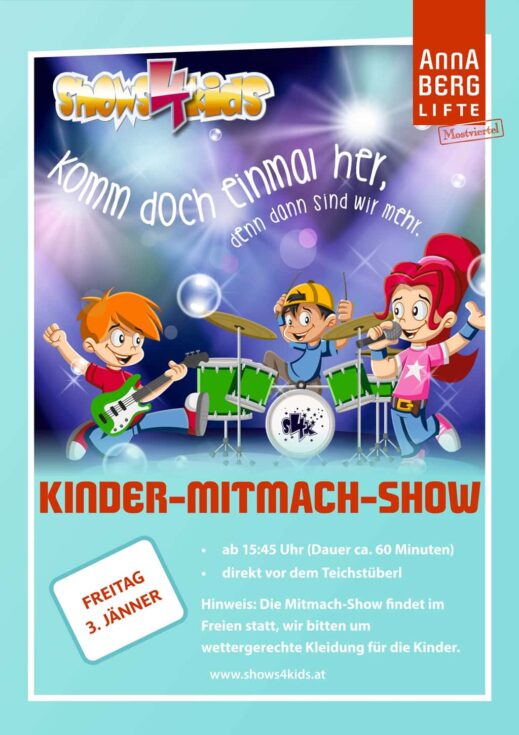 Kinder-Mitmach-Show ab 15:45 Uhr direkt vorm Teichstüberl (Dauer ca. 60 Minuten).