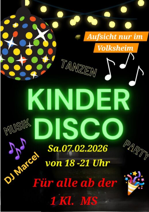 Am Samstag, 7. Februar 2026 findet für alle Kinder ab der 1. Klasse MS eine Kinder- und Jugenddisco im Volksheim Gußwerk statt.