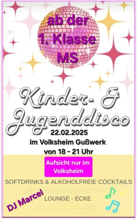 Am Samstag, 22. Februar 2025 findet für alle Kinder ab der 1. Klasse MS eine Kinder- und Jugenddisco im Volksheim Gußwerk statt.