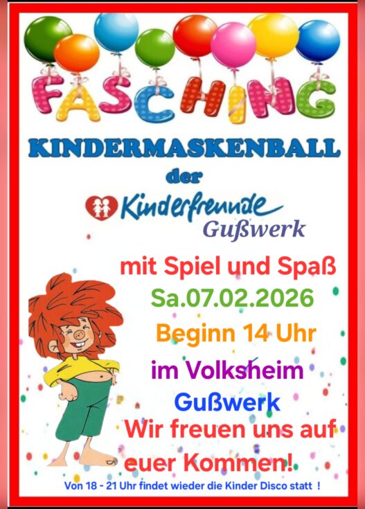 Am Samstag, 7. Februar 2026 findet ab 14:00 Uhr der Kinderfasching im Volksheim Gußwerk statt.