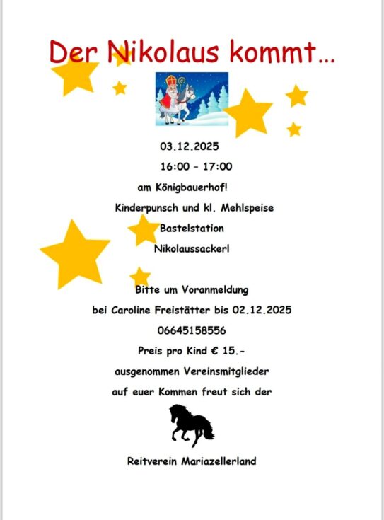 Am Mittwoch, 3. Dezember 2025 kommt der Nikolaus von 16:00 bis 17:00 Uhr zum Königbauerhof.