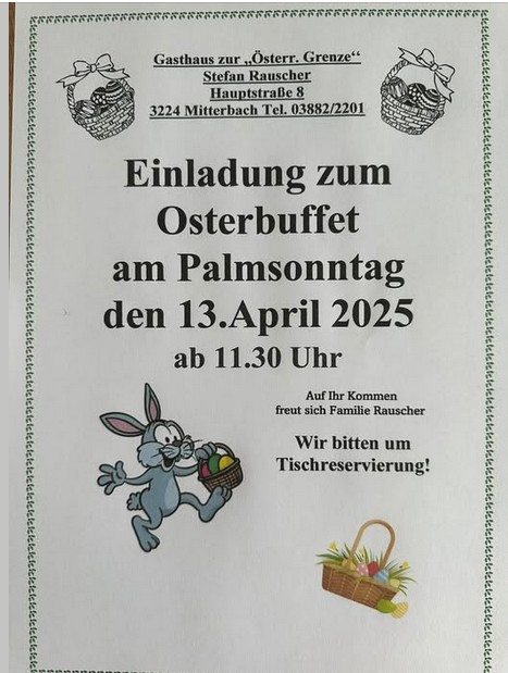 Am Palmsonntag, 13. April 2025 findet ab 11:30 Uhr ein Osterbuffet im Gasthaus zur „Österr. Grenze“ statt.