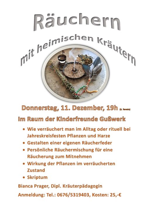 Am Donnerstag, 11. Dezember 2025 findet um 19:00 Uhr im Raum der Kinderfreunde Gußwerk der Workshop „Räuchern mit heimischen Kräutern“ statt.